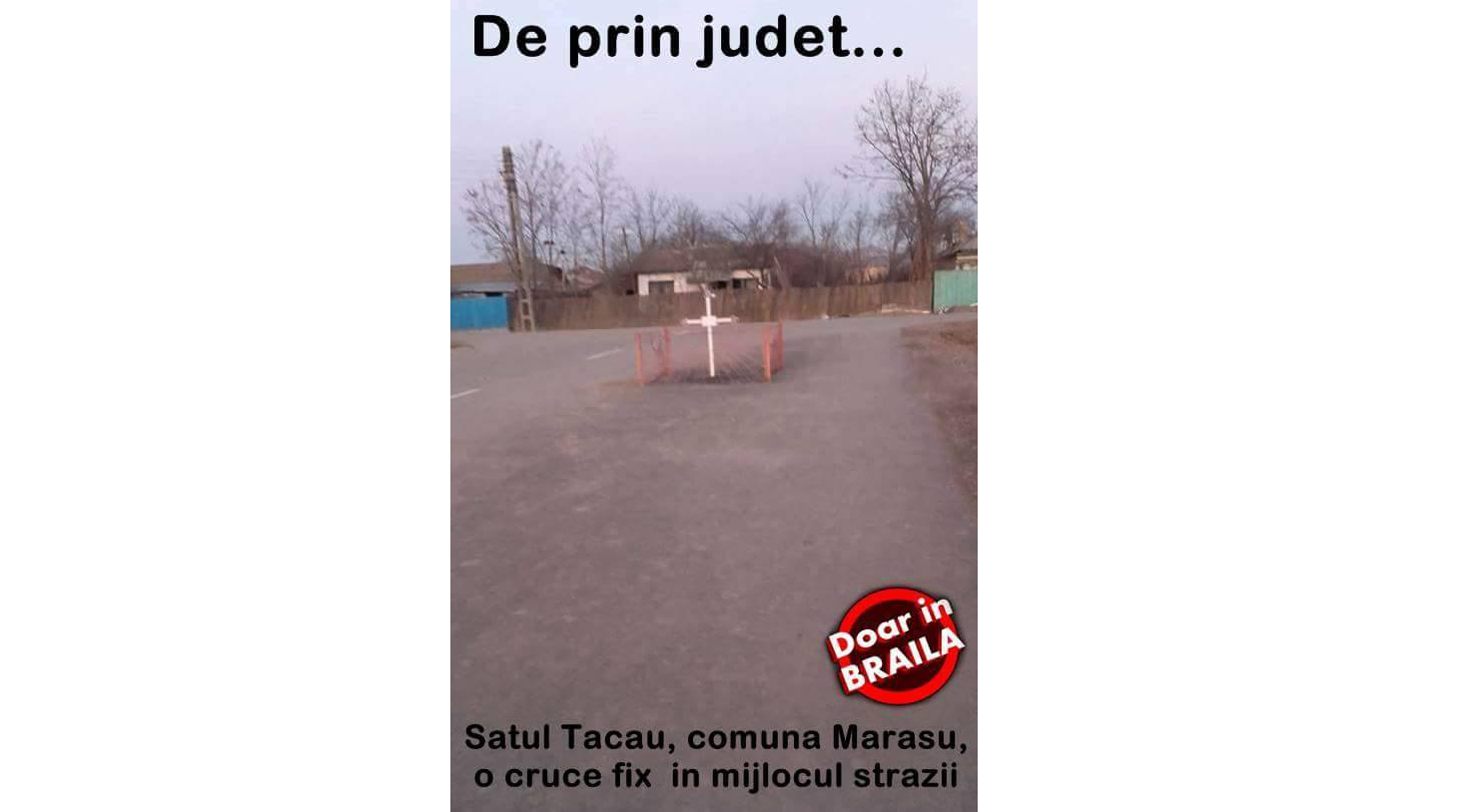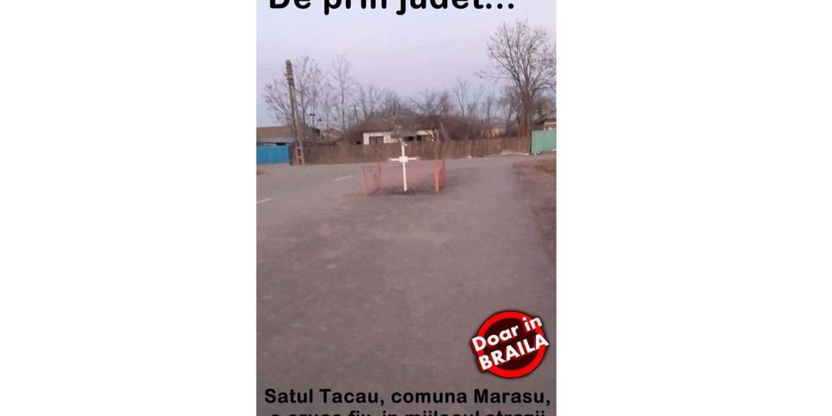 O fotografie care circulă de ceva vreme pe reţelele de socializare înfăţişează o cruce de metal împrejmuită cu un gard de fier forjat, ca la cimitir. Numai că respectivul ansamblu nu se află într-un cimitir, ci pare a fi amplasat exact pe mijlocul uneia dintre cele două benzi de mers ale unei străzi asfaltate. Pe poză este pusă eticheta „Doar în Brăila”, iar cel care a distribuit-o pe internet a ţinut să facă următoarea precizare: „De prin judeţ... Satul Ţăcău, comuna Măraşu, o cruce fix în mijlocul străzii”.
