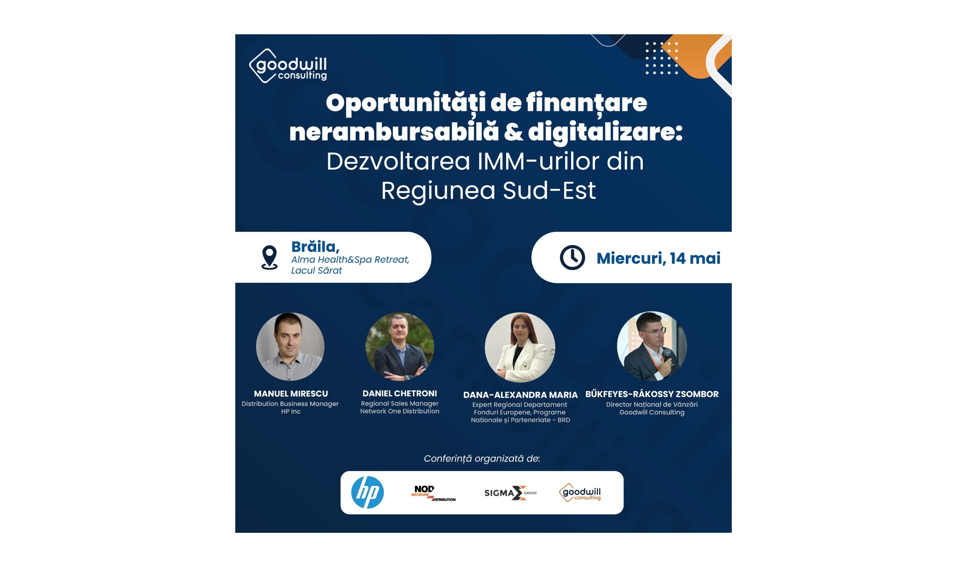 Evenimentul este organizat de Goodwill Consulting, în parteneriat cu HP Inc. România, Network One Distribution (NOD), Sigma Distribution și BRD Groupe Société Générale – companii care susțin activ digitalizarea, modernizarea și finanțarea inteligentă a mediului de afaceri românesc.