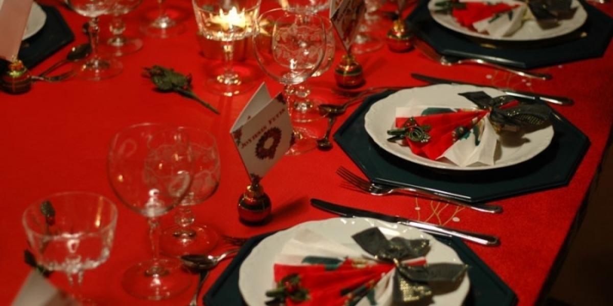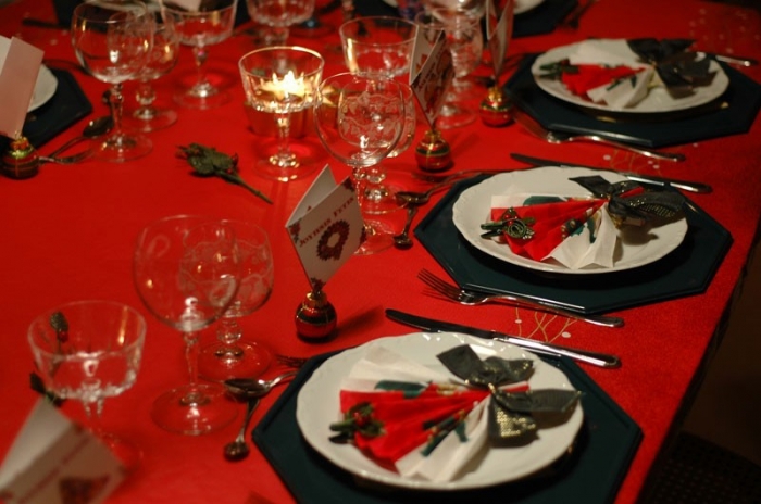 În primul rând vom alege o faţă de masă curată, din ţesătură, în niciun caz din plastic, cu un imprimeu specific sărbătorilor - Moş Crăciun, om de zăpadă, crengi de brad, globuri, clopoţei. În acelaşi ton vor fi şi şerveţelele. Nu vom neglija decorurile - suporturi cu lumânări, un aranjament cu crenguţe de brad şi câteva globuri, un platou cu fructe. Dacă vreţi originalitate, în locul tradiţionalelor sfeşnice pentru lumânări, puteţi pune lumânările în mere scobite în locul codiţei.