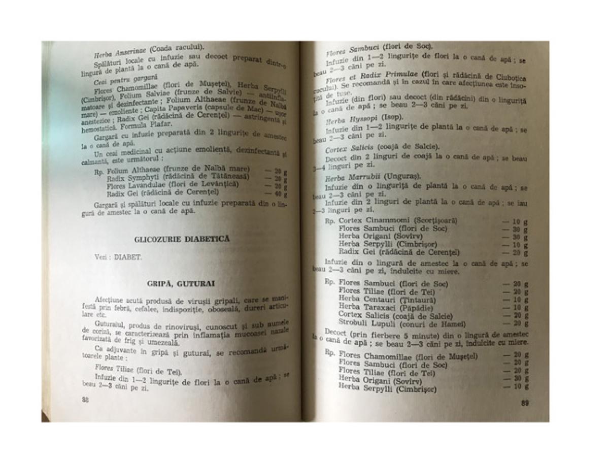 Şi în anii '80, gripa era definită ca fiind o boală infecto-contagioasă, cauzată de virusuri, caracterizată prin febră şi, în special, prin simptome ale aparatului respirator (tuse, strănut, coriză). Pe lângă recomandarea repaosului la pat şi a unui consum echilibrat de alimente bogate în vitamine, autorii acestor cărţi vin şi cu formulele ceaiurilor vindecătoare, pe care le vom enumera în continuare.