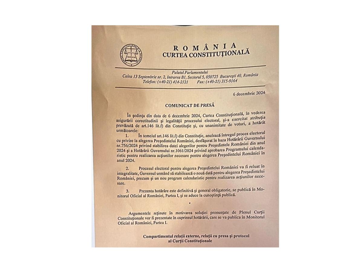 Curtea Constituțională a decis, astăzi, anularea primului tur al alegerilor prezidențiale, procesul electoral urmând să fie reluat în integralitate. Astfel, Guvernul va trebui să stabilească o nouă dată, iar întregul proces electoral va fi reluat, începând cu înscrierea și validarea candidaturilor. „În temeiul art.146 lit.f) din Constituție, anulează întregul proces electoral cu privire la alegerea Preşedintelui României, desfăşurat în baza Hotărârii Guvernului nr.756/2024 privind stabilirea datei alegerilor pentru Preşedintele României din anul 2024. Procesul electoral pentru alegerea Preşedintelui României va fi reluat în integralitate, Guvernul urmând să stabilească o nouă dată pentru alegerea Preşedintelui României, precum şi un nou program calendaristic pentru realizarea acţiunilor necesare”, transmite CCR.