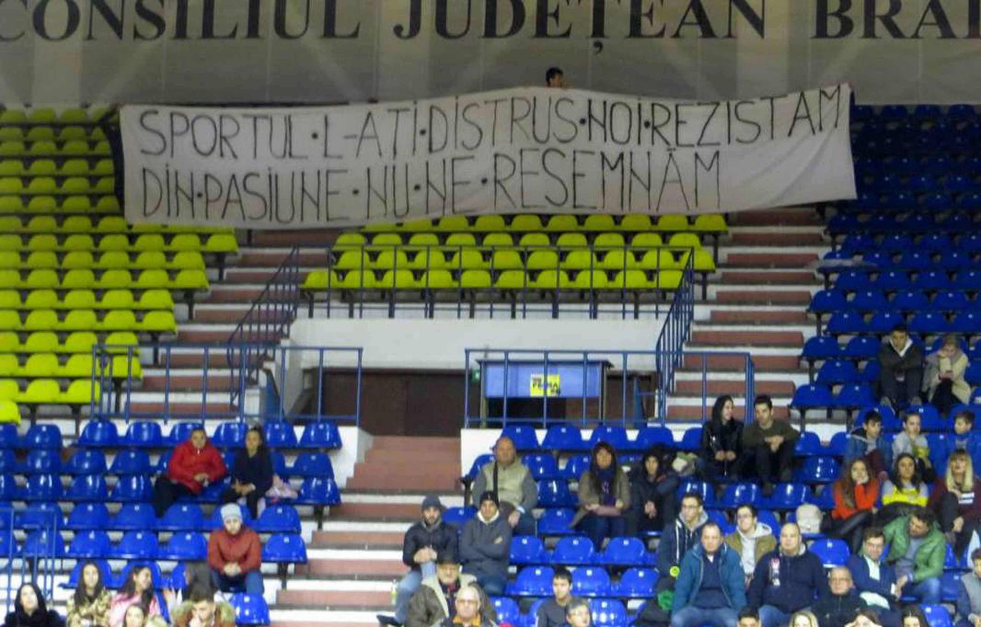 • formaţia brăileană continuă traseul în Liga Naţională de baschet masculin • “Sportul l-aţi distrus, noi rezistăm din pasiune, nu ne resemnăm!”, este mesajul pe care suporterii l-au afişat în Polivalentă • aceştia au taxat şi de această dată lipsa de reacţie autorităţilor locale care nu sprijină financiar sportul brăilean