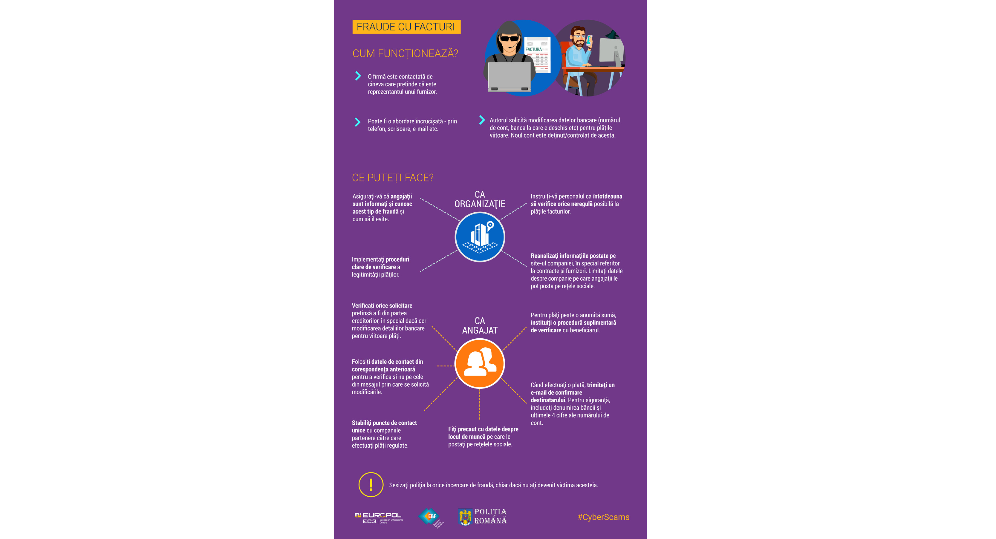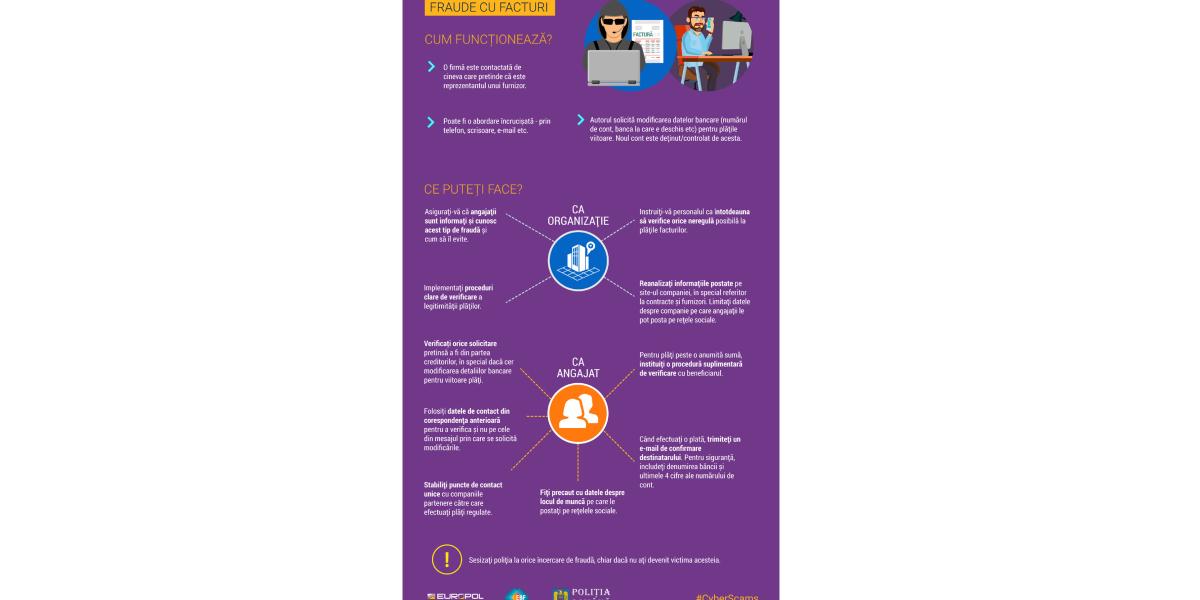 Ieri, campania europeană de prevenire a fraudelor pe internet - CyberScams, derulată în scopul creşterii gradului de conştientizare în rândul beneficiarilor cu privire la acest fenomen infracţional, a continuat cu prezentarea modului în care escrocii acţionează în cazul fraudelor cu facturi.