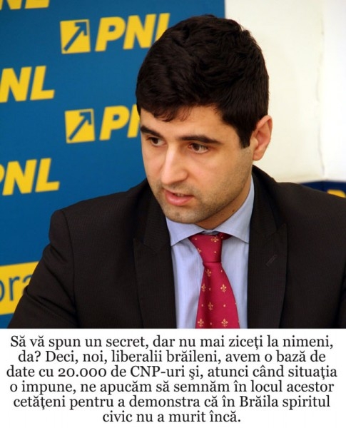 De exemplu, zilele trecute, Alexandru Dănăilă, care este şi viceprimar în guvernarea locală a PSD Brăila, a ieşit public să spună că PNL a strâns 7.150 de semnături - pentru ce credeţi? - pentru demiterea premierului Victor Ponta. Voi realizaţi ce preocupări au ăştia de la PNL? Auzi la ei, cică strâng semnături pentru demiterea unuia care oricum o să demisioneze de bunăvoie şi nesilit de nimeni. Această campanie de 2 lei îmi sună la fel de penibil ca demersurile alea de pe Facebook, cu petiţii pentru diferite cauze, care evident nu au absolut nicio finalitate, care nu folosesc nimănui. Dar liberalii brăileni, ce să facă şi ei? Se supun ordinelor venite de la centru, de la tanti Alina Gorghiu şi nenea Vasile Blaga, şi fac colecţii de semnături, ca şi cum treaba asta l-ar determina pe Victor Ponta să plece din fruntea guvernului.