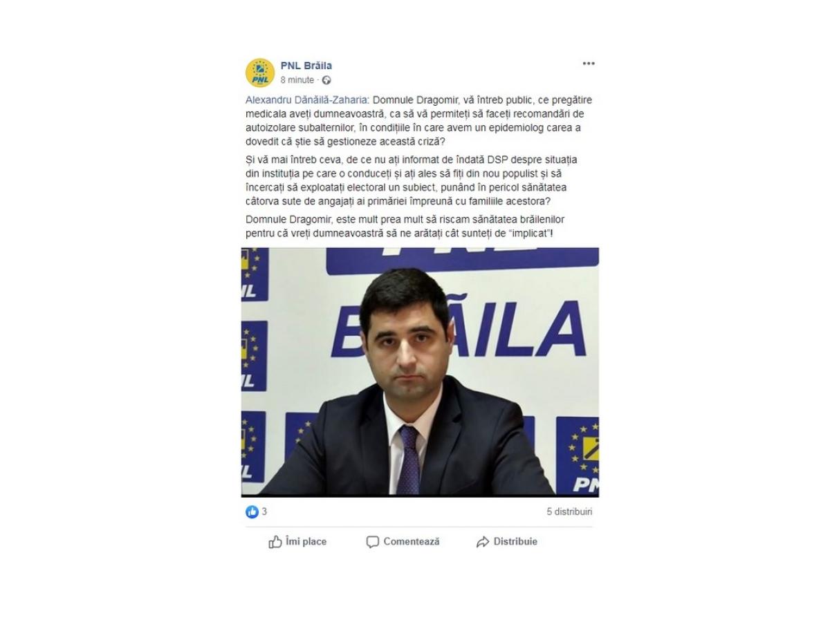 ”Domnule Dragomir, vă întreb public, ce pregătire medicală aveți dumneavoastră, ca să vă permiteți să faceți recomandări de autoizolare subalternilor, în condițiile în care avem un epidemiolog care a dovedit că știe să gestioneze această criză? Și vă mai întreb ceva: de ce nu ați informat de îndată DSP despre situația din instituția pe care o conduceți și ați ales să fiți din nou populist și să încercați să exploatați electoral un subiect, punând în pericol sănătatea câtorva sute de angajați ai primăriei împreună cu familiile acestora? Domnule Dragomir, este mult prea mult să riscăm sănătatea brăilenilor pentru că vreți dumneavoastră să ne arătați cât sunteți de «implicat»!”, a scris acesta pe pagina sa de Facebook.