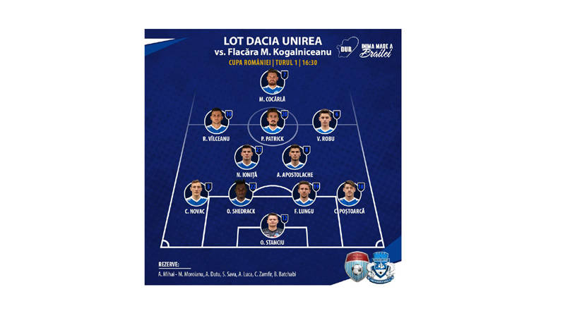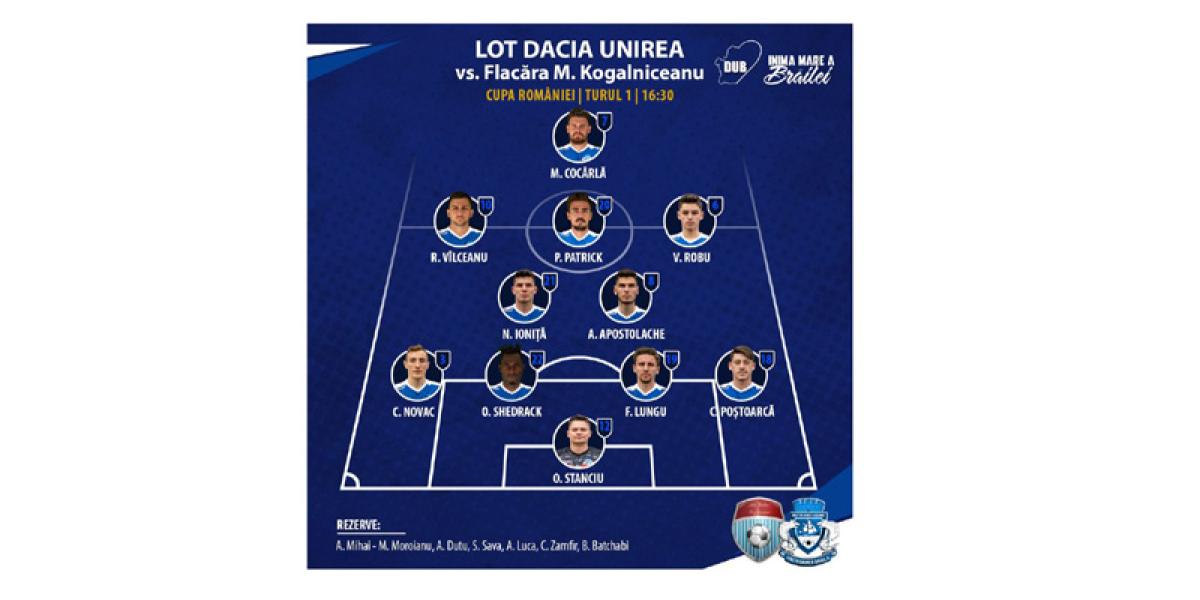 Dacia Unirea s-a calificat în etapa a 2-a naţională a Cupei României după o victorie categorică, 4-0, în deplsasare, la Flacăra Mihail Kogălniceanu, echipă din Liga a IV-a din judeţul Tulcea. Scorul putea fi însă unul cel puţin dublu dacă Patrick Petre, Vîlceanu şi Duţu nu trimeteau mingea în barele porţii adverse. De asemenea, în repriza a doua, Sava şi Duţu au rămas, pe rând, în situaţie de unu la unu cu portarul advers dar nu au reuşit să-l învingă.