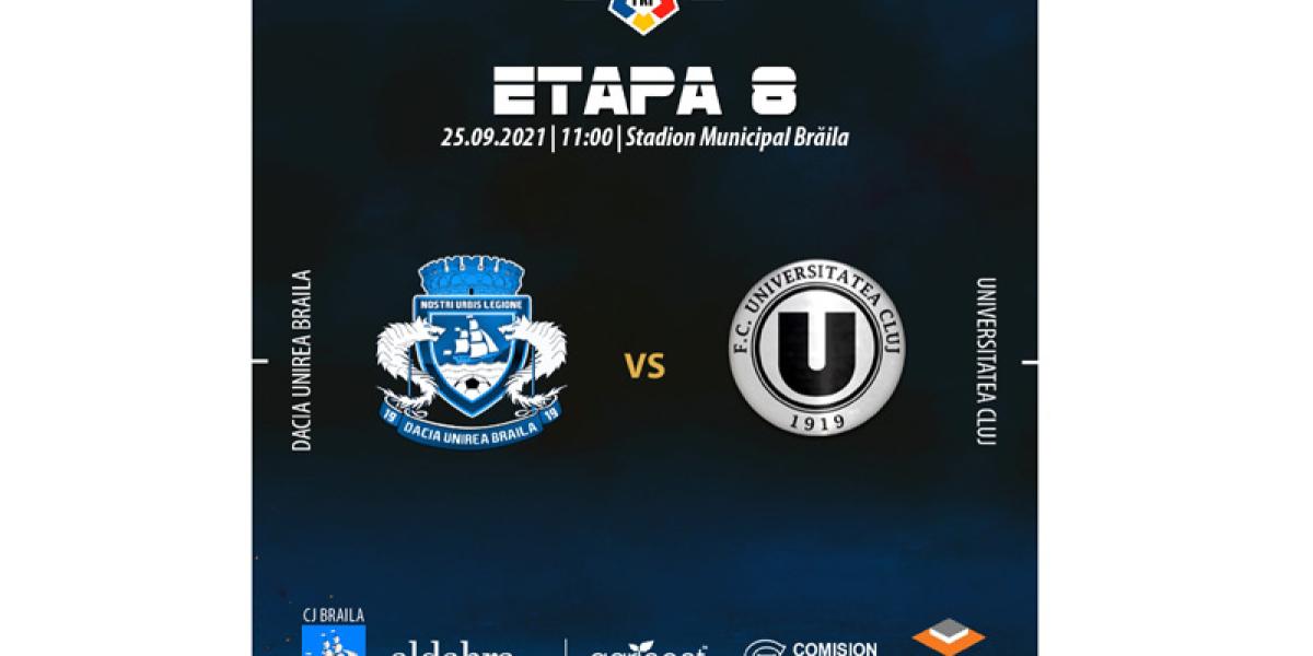 Meciul dintre Dacia Unirea și Universitatea Cluj se dispută sâmbătă, de la ora 11.00, pe Stadionul Municipal și este transmisă în direct de DigiSport 1, TelekomSport și Look Sport.