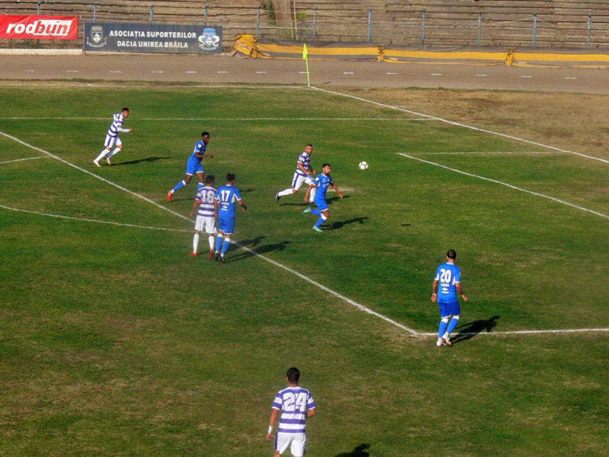 În prima repriză jocul a avut ritm. Dacia Unirea a irosit în minutul 17 prima mare ocazie de gol a primei reprize prin Bebey, care, din colţul careului mic, a şutat pe lângă poartă. Bănăţenii au preluat iniţiativa, iar în minutul 21 Plămadă a căzut în careul brăilean după un duel la minge cu Niţă şi Pleşa, jucătorul oaspeţilor a protestat cerând lovitură de pedeapsă dar s-a ales doar cu un cartonaş galben. La faza imediat următoare, Bebey a rămas singur cu Murariu dar a şutat telefonat, iar portarul oaspeţilor a pus un picior salvator pentru formaţia sa.