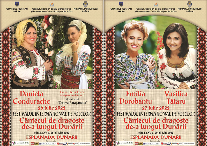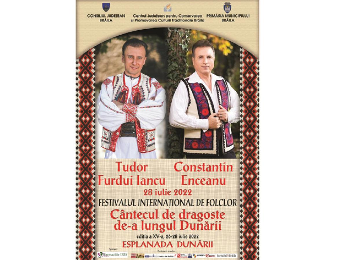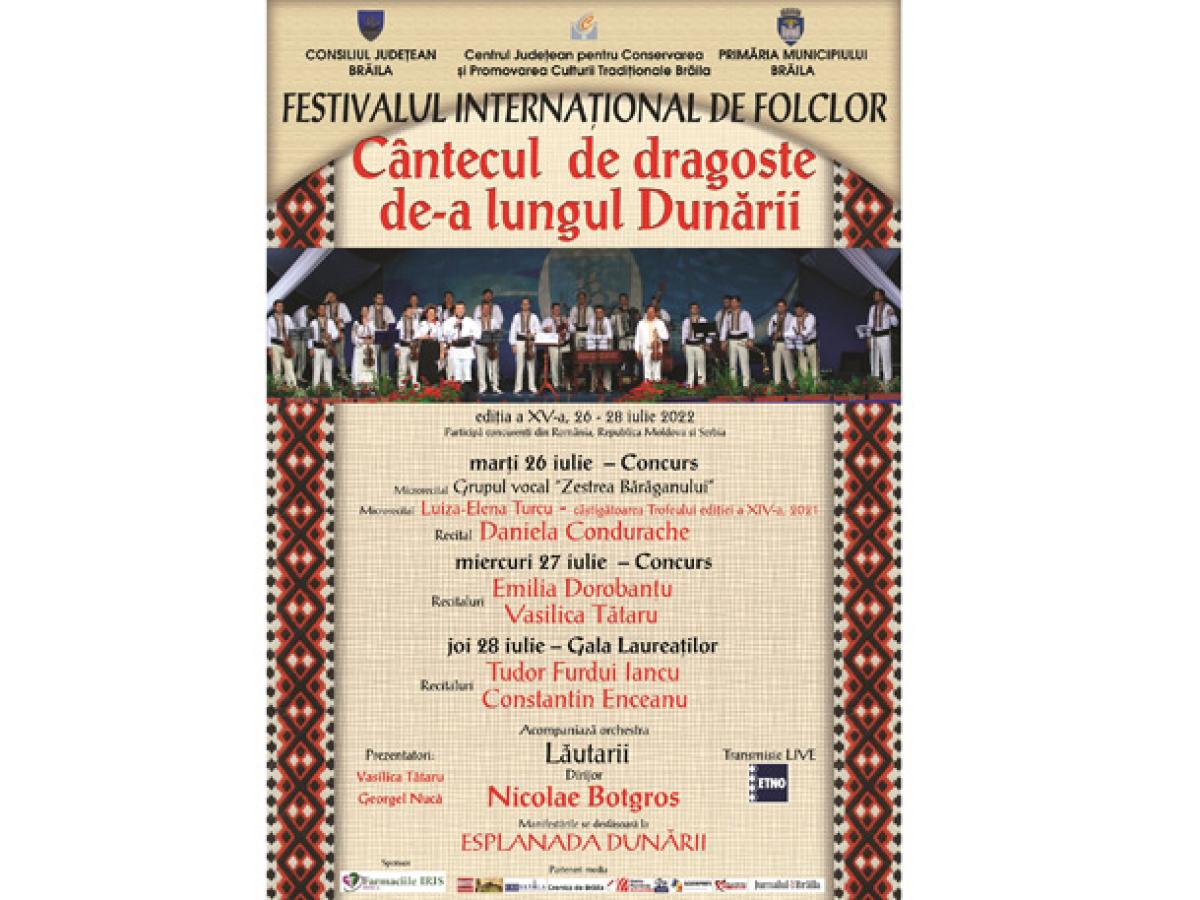 Organizat de Centrul Județean pentru Conservarea și Promovarea Culturii Tradiționale Brăila (Centrul de Creație), în colaborare cu Consiliul Județean și Primăria Municipiului Brăila, Festivalul Internațional de Folclor "Cântecul de dragoste de-a lungul Dunării" - Ediția a XV-a, se va bucura de prezența unor mari nume ale folclorului românesc actual, pe lângă cei 30 de concurenți din România, Moldova și Serbia.