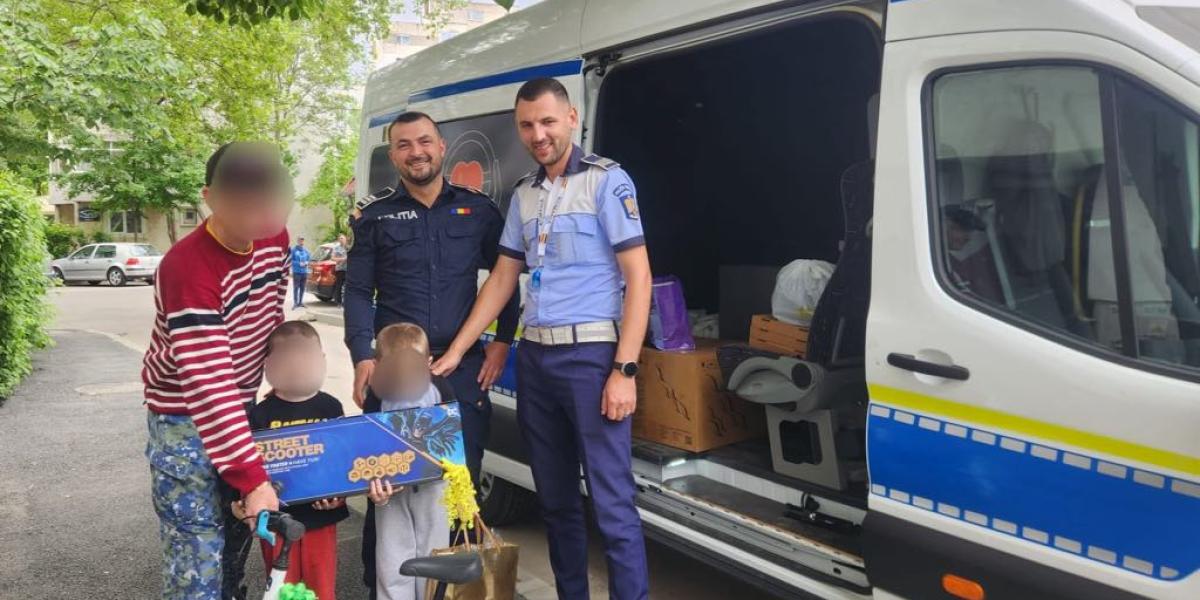 * doi copii în vârstă de aproape 6 ani, care urmăreau cu atenţie, de pe trotuar, activitatea unui polițist din cadrul Serviciului Rutier Brăila, au atras atenţia * Cosmin s-a apropiat de copii şi a vorbit cu ei, a aflat că cei doi sunt frați gemeni, nu mai au mamă, aceasta fiind răpusă de o boală grea și își doresc să devină polițiști * Cosmin, și câțiva colegi au oferit daruri ce au constat în hăinuțe, alimente, jucării, bani, dar și abonament la un curs de înot, o programare la un control stomatologic pentru cei doi frați * poliţiştii se vor preocupa ca cei mici sa meargă la o petrecere pentru copii, cu tema sărbătorilor pascale