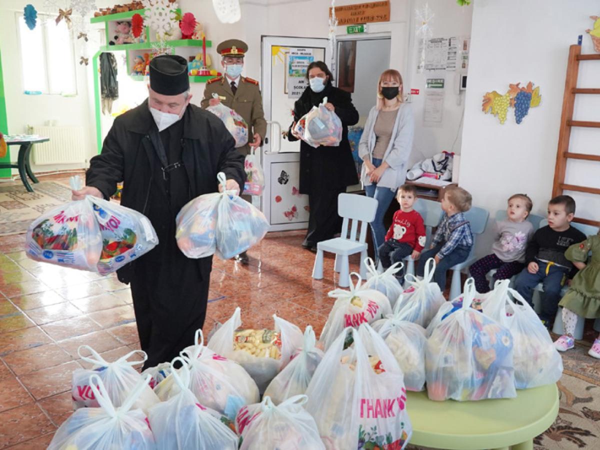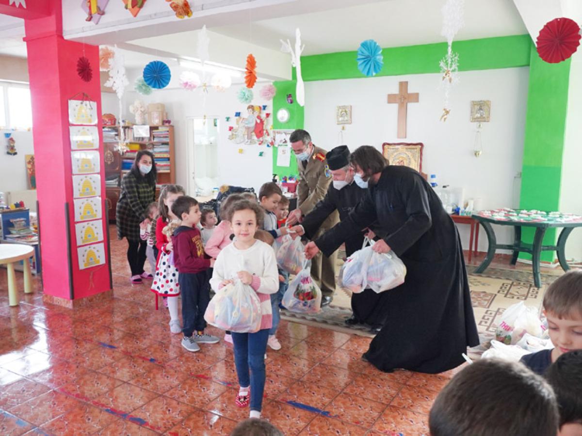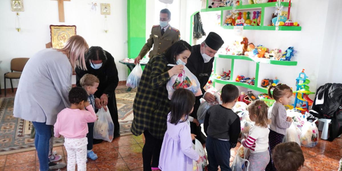 * darurile au fost pregătite de Parohia "Adormirea Maicii Domnului" și de Capela Militară "Sf. Martiri Brâncoveni" * Copiii de la Grădinița "Familia" provin din familii cu posibilități materiale reduse, inclusiv familii de romi și familii monoparentale * unii dintre micuți sunt rămași în grija rudelor, întrucât părinții lor sunt plecați în străinătate