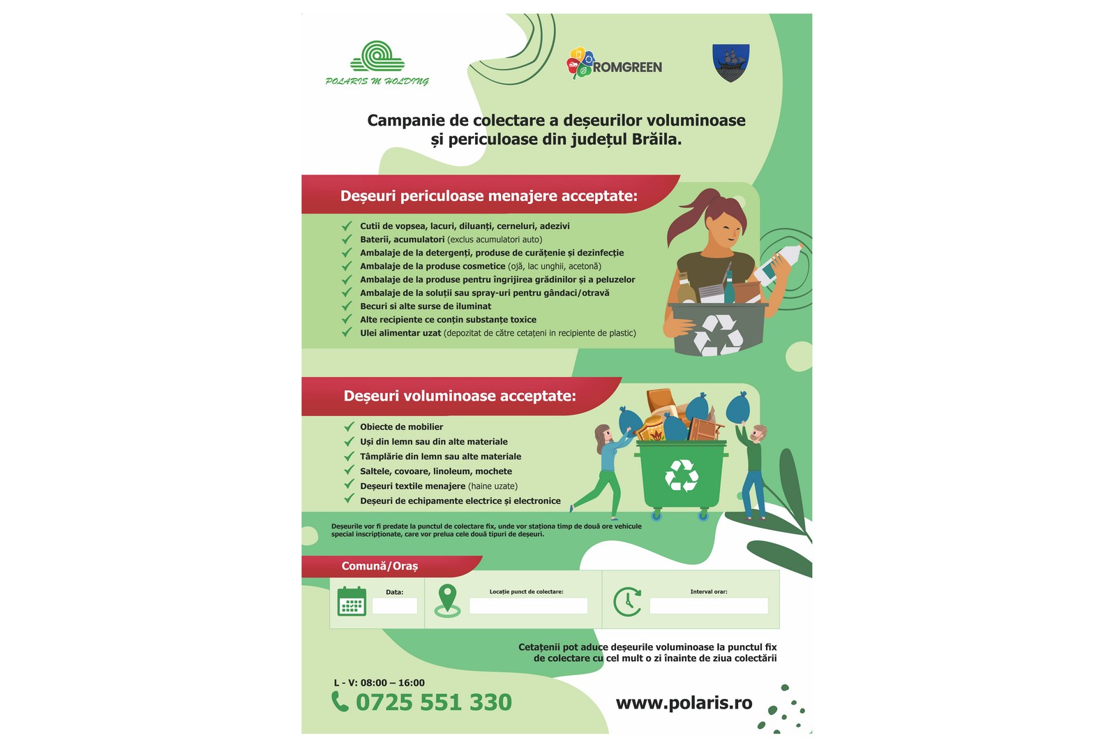 Operatorul de salubritate Polaris M Holding SRL anunță că, în perioada 14 – 22 octombrie, se va derula campania trimestrială de colectare GRATUITĂ a deșeurilor voluminoase și a celor periculoase menajere în toate comunele din Zona 1 din Județul Brăila. În această zonă sunt incluse următoarele localități: Cazasu, Chiscani, Frecăței, Gemenele, Mărașu, Măxineni, Romanu, Salcia Tudor, Scorțaru Nou, Siliștea, Tichilești, Tudor Vladimirescu, Vădeni. Campania se adresează populației și este organizată de compania de salubritate Polaris, în calitate de lider al Asocierii și PHG Waste Management SRL (Asociat), în parteneriat cu Asociația de Dezvoltare Intracomunitară (ADI) Eco Dunărea Brăila.