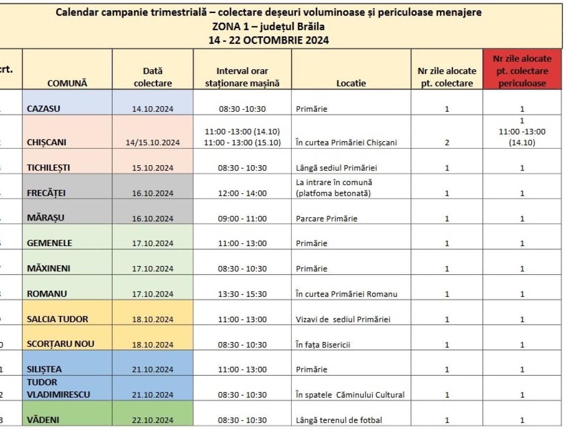 * este vorba despre comunele incluse în Zona 1 de activitate a operatorului de salubritate Polaris - Cazasu, Chiscani, Frecăței, Gemenele, Mărașu, Măxineni, Romanu, Salcia Tudor, Scorțaru Nou, Siliștea, Tichilești, Tudor Vladimirescu, Vădeni * campania se va derula în perioada 14 - 12 octombrie, în zilele și punctele de colectare stabilite pentru fiecare comună în parte, așa cum sunt menționate în tabelul atașat acestui articol