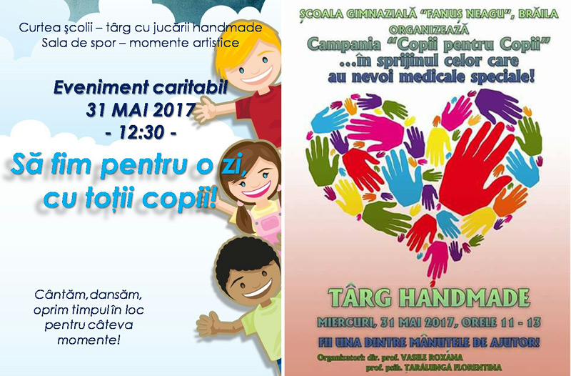 • astăzi au loc două acţiuni caritabile, în scopul de a-i ajuta pe alţi copii din Brăila aflaţi în mare nevoie • la Liceul “Perpessicius” are loc Târgul “Să fim pentru o zi, cu toţii copii”, iar fondurile strânse vor merge la Cristian Filip • la Şcoala “Fănuş Neagu” are loc evenimentul “Copii pentru copii”, banii donaţi fiind apoi direcţionaţi pentru cauza Giuliei, fetiţa de doi anişori bolnavă de leucemie, şi a Ştefaniei, o elevă a şcolii bolnavă de cancer