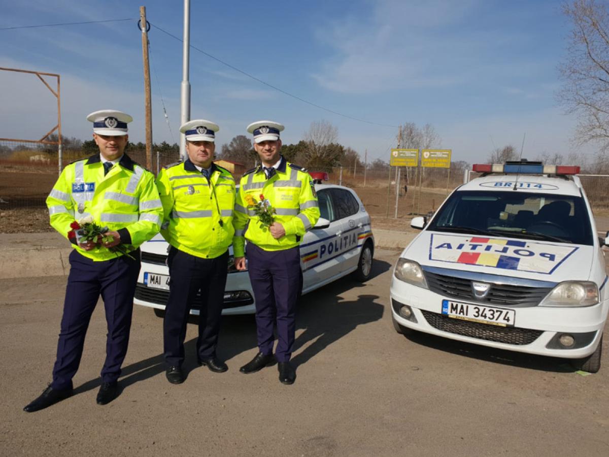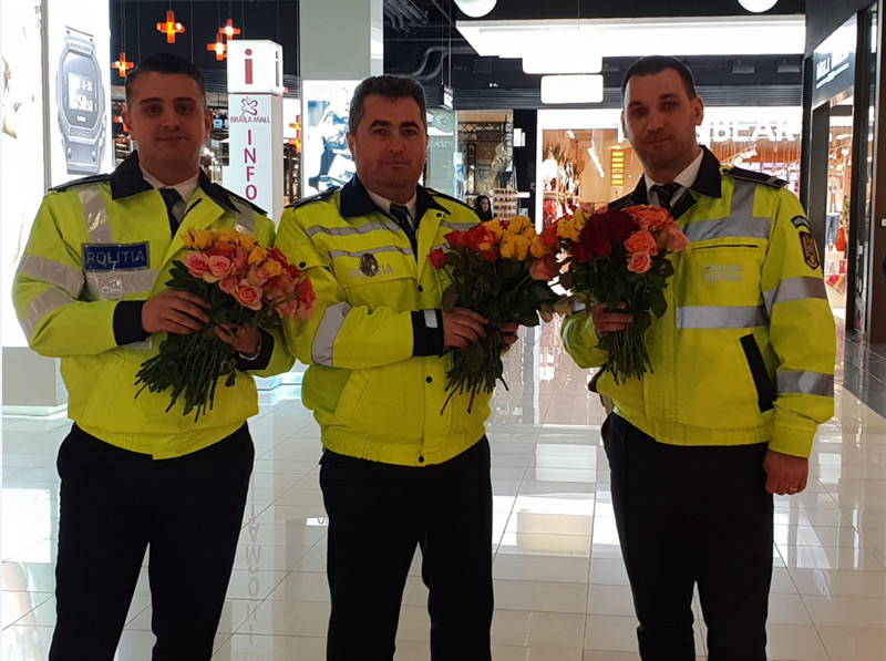 Poliţişti în acţiune. Ziua de 8 Martie le-a oferit un nou prilej poliţiştilor din cadrul Inspectoratului de Poliţie Judeţean Brăila de a aduce un zâmbet doamnelor şi domnişoarelor. Oamenii legii au oferit flori brăilencelor care circulau cu autoturismele în zona rondou Mall şi care se aflau la cumpărături în supermarket. De ziua lor, femeile nu au primit numai flori ci şi sfaturi importante din partea poliţiştilor. S-a acţionat în scopul prevenirii implicării femeilor în evenimente rutiere sau în alte infracţiuni, ale căror victime sunt cu preponderenţă. Poliţiştii rutieri au venit cu recomandări pentru a le ajuta pe conducătoarele auto să evite accidentele, în timp ce poliţiştii de prevenire au transmis doamnelor sfaturi pentru prevenirea şi gestionarea situaţiilor de violenţă domestică. Poliţiştii le transmit “La multi ani!” tuturor brăilencelor.
