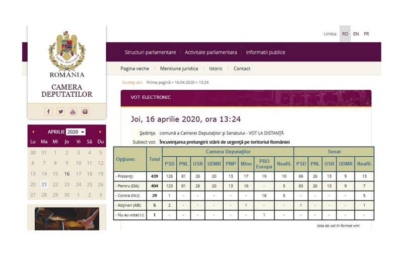 Precizăm că votul privind proiectul pentru prelungirea stării de urgenţă în România a avut loc într-o şedinţă comună a celor două Camere, la distanţă, în format electronic, în data de 16 aprilie (joi). La vremea respectivă, restul deputaţilor şi senatorilor brăileni au votat “DA” pentru prelungirea stării de urgenţă în România. Potrivit informaţiilor urcate pe site-ul Camerei Deputaţilor, la acest proiect au fost 404 voturi “DA”, 29 - “NU”, 5 abţineri, în timp ce un parlamentar din cei 439 prezenţi a preferat să nu voteze.