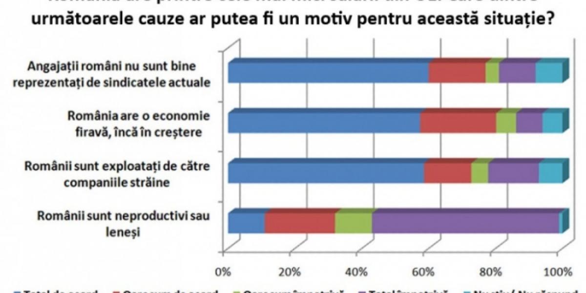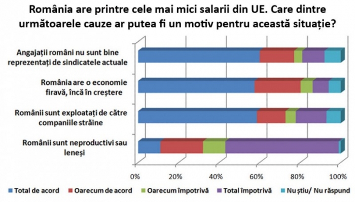 Astfel, 77% dintre participaţii la sondaj sunt total (60%) sau parţial (17%) de acord cu faptul că angajaţii români nu sunt bine reprezentaţi de sindicatele actuale, relevă sondajul preluat de Agerpres. În acelaşi timp, 58% dintre participanţi sunt total de acord că salariile mici sunt cauzate de slaba dezvoltare a economiei, iar 23% sunt parţial de acord. Aproape trei sferturi dintre români susţin că salariile mici sunt cauzate de faptul că angajaţii din România sunt exploataţi de către companiile străine.