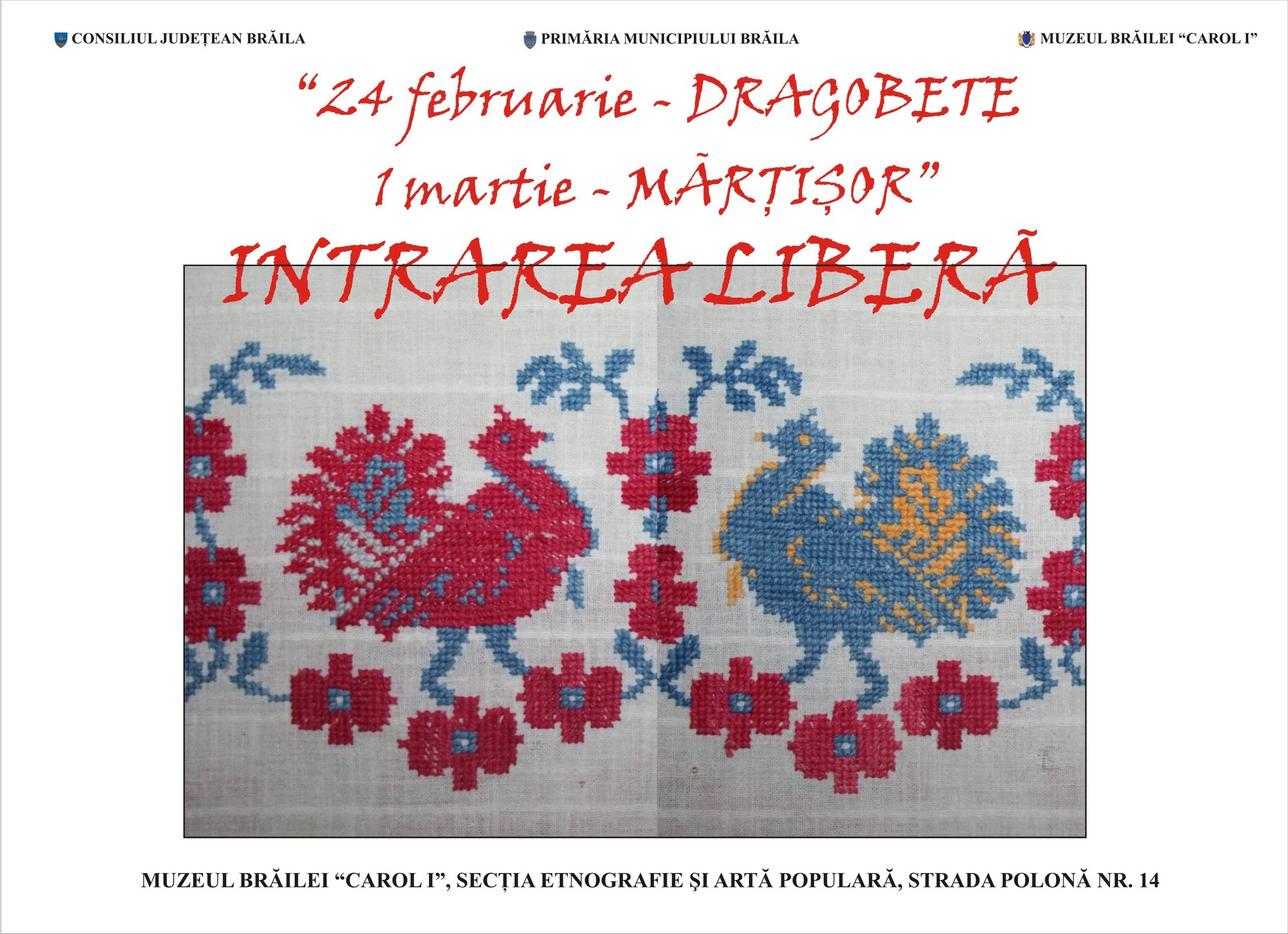 De Dragobete (24 februarie) și de Mărțișor (1 martie), intrarea este liberă în expozițiile deschise la Muzeul Brăilei „Carol I” - Secția Etnografie, din Strada Polonă nr.14).