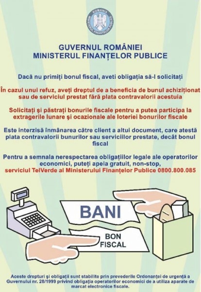Operatorii economici sunt nevoiţi să pună la vedere acest afiş (vezi foto), începând de duminică, 1 martie, avertizează Administraţia Judeţeană a Finanţelor Publice Brăila. Anunţul îi atenţionează pe clienţi că pot refuza să plătească pentru un bun sau un serviciu, în cazul în care comerciantul refuză să dea bon fiscal. "Începând cu data de 1 martie 2015, operatorii economici care au obligaţia, potrivit legii, de a utiliza aparate de marcat electronice fiscale, afişează anunţul prevăzut la art.1 la locul de amplasare a aparatelor de marcat electronice fiscale, în aşa fel încât să fie vizibil clienţilor", se arată în comunicatul de presă al finanţelor locale. În cazul restaurantelor, afişul trebuie pus pe prima pagină a meniului, se mai precizează în documentul citat: "Operatorii economici care desfăşoară activităţi comerciale în unităţi de tip restaurant, bar, discotecă, club, şi altele asemenea, asigură informarea clienţilor şi prin tipărirea anunţului de atenţionare pe prima pagină a meniurilor pe care le pun la dispoziţia acestora, ori prin alte mijloace, astfel încât, la fiecare masă destinată clienţilor, aceştia să aibă permanent posibilitatea de a citi anunţul de atenţionare".