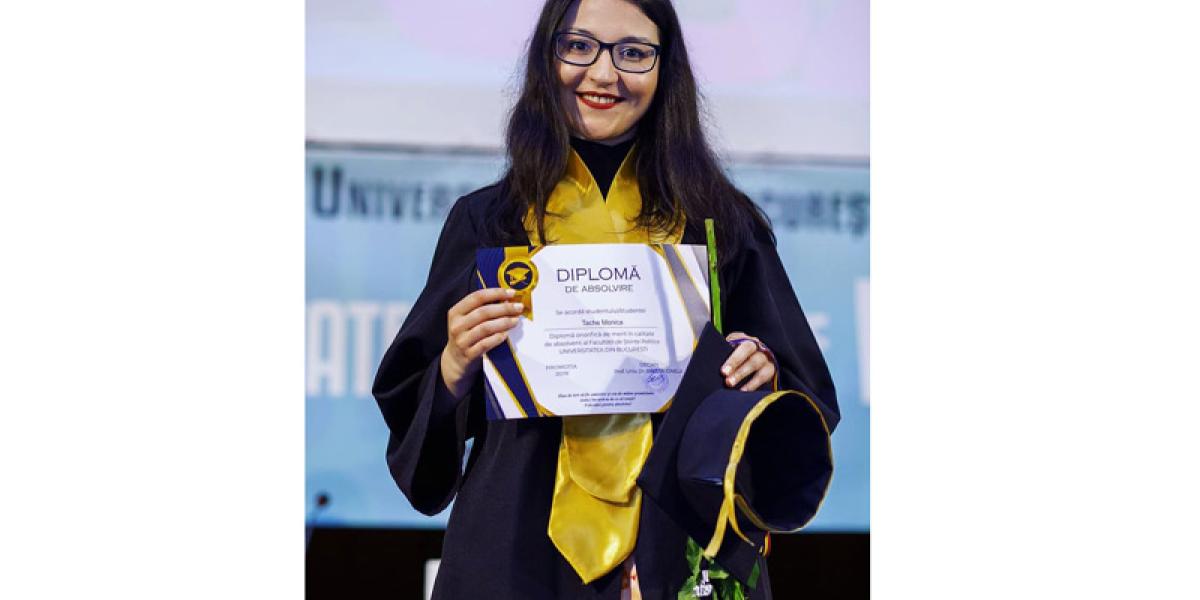 Primul titlu de şefă de promoţie pe care Monica Gabriela Tache l-a obţinut a fost în gimnaziu (2012), în cadrul Liceului Teoretic “Panait Cerna”. Patru ani mai târziu, în 2016, la terminarea liceului, aceasta era din nou desemnată şefă de promoţie, tot în cadrul Liceului “Cerna”. Iar acum, în 2019, Monica este probabil prima studentă din Brăila care devine şefă de promoţie la Ştiinţe Politice în Limba Franceză, specializare a Facultăţii de Ştiinţe Politice din cadrul Universităţii Bucureşti. Aceasta ne-a spus că facultatea şi tot ce a însemnat viaţa de studentă i-a depăşit cu mult aşteptările.