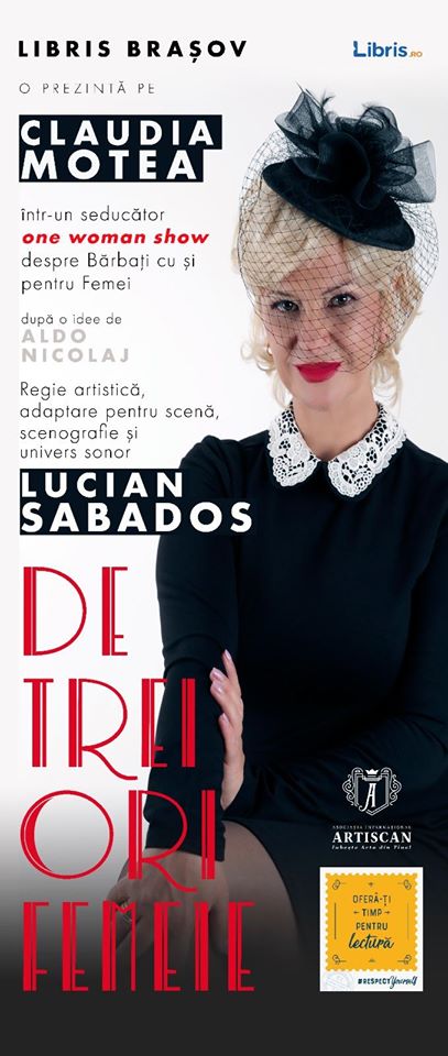 Sâmbătă, 30 noiembrie, de la ora 19,00, la Sala Studio a Teatrului "Maria Filotti", la o săptămână de la proaspăta premieră de la Teatrul NOTTARA, din 21 noiembrie, va avea loc spectacolul DE TREI ORI FEMEIE. Cu o versiune scenică originală, după o idee de Aldo Nicolaj, cu actriţa Claudia Motea, parcă mai convingătoare ca oricând, spectacolul, în regia şi scenariul lui Lucian Sabados, înseamnă comedie, suspans, răsturnări de situaţie şi multă multă emoţie. Trei în unu! Adică, DE TREI ORI FEMEIE!