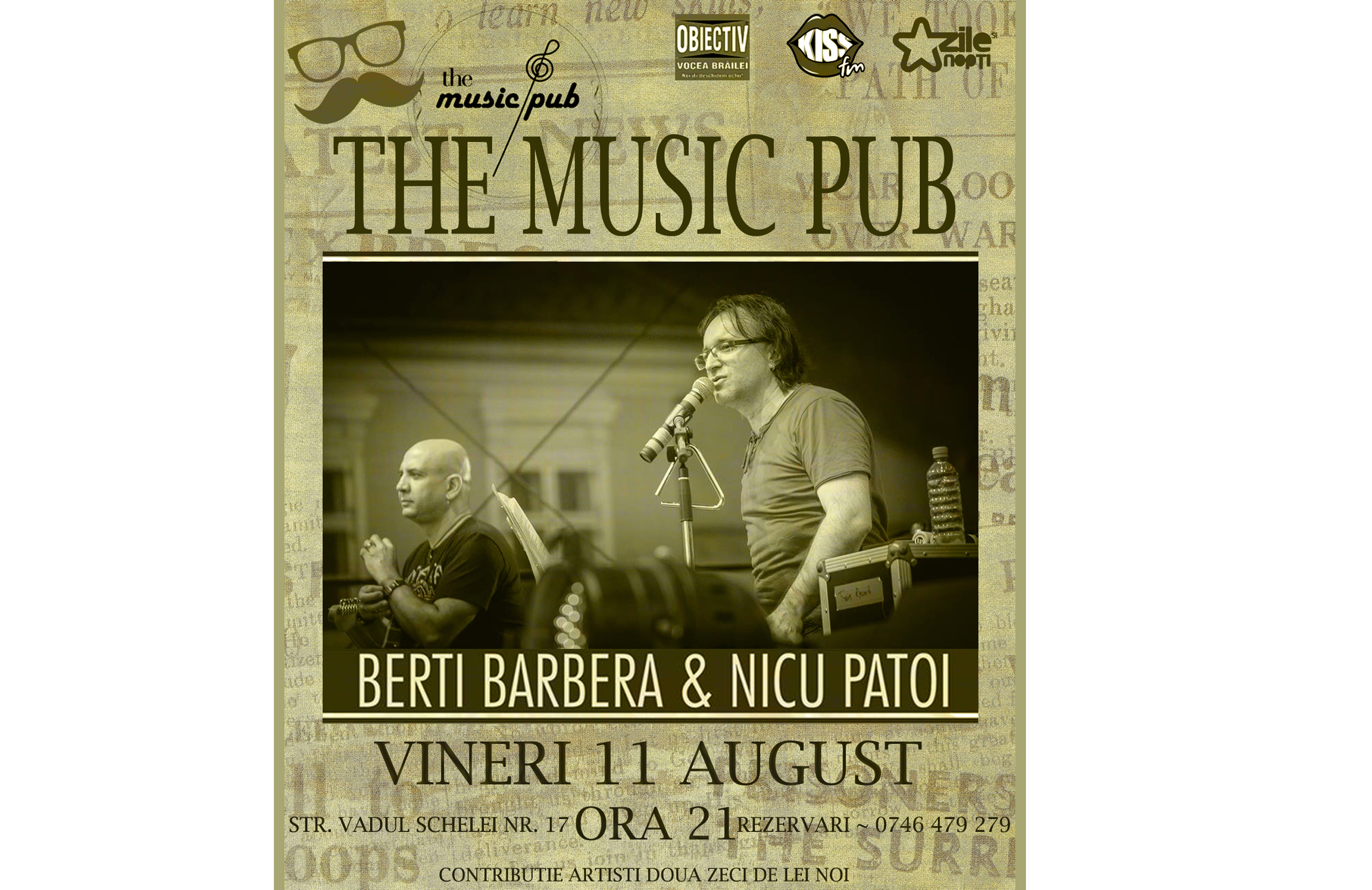 Se anunţă o perioadă de sărbătoare pentru brăileni începând din acest weekend, iar Zilele Brăilei vor fi în centrul atenţiei şi pe terasa The Music Pub. Este vorba despre un concert Berti Barbera şi Nicu Patoi, doi artişti extrem de cunoscuţi în rândul iubitorilor de muzică bună, care vin în oraşul nostru cu un proiect nou, tocmai cu ocazia Zilelor Municipiului Brăila. Concertul va fi unul în aer liber, pe scena terasei The Music Pub (lângă patinoar), vineri, 11 august, începând cu ora 21:00 şi are ca obiectiv principal, potrivit organizatorilor, aducerea laolaltă a oamenilor de valoare din oraş, care ascultă muzică pop, blues, rock sau jazz.