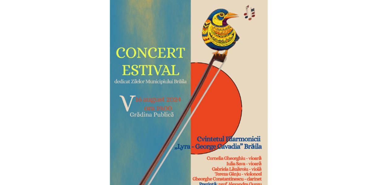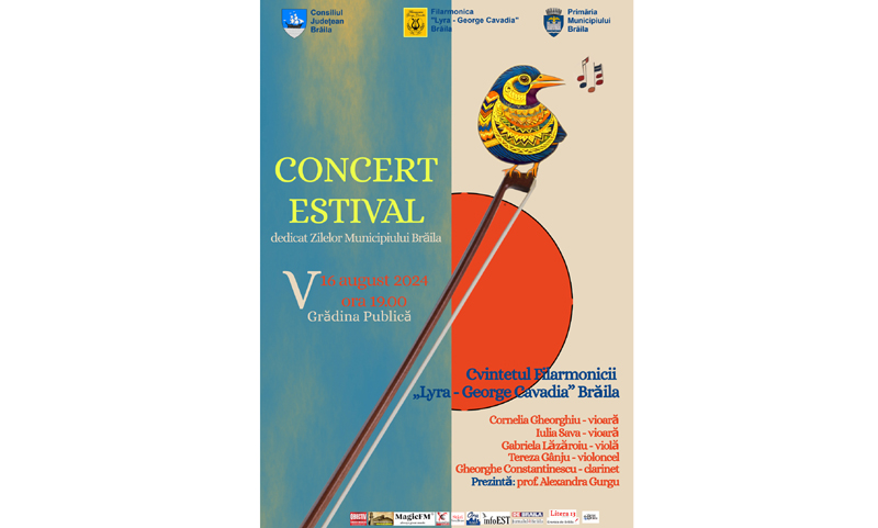 „Filarmonica „Lyra - George Cavadia”, reper al culturii brăilene, nu putea lipsi nici în acest an de la sărbătoarea dedicată urbei noastre. Așa cum v-a obișnuit, Cvintetul filarmonicii, format din violonistele Cornelia Gheorghiu și Iulia Sava, violista Gabriela Lăzăroiu, violoncelista Tereza Gânju și clarinetistul Gheorghe Constantinescu, vă va purta pe meleaguri sonore pline de serenitate, în cadrul Concertului estival ce va avea loc pe data de 16 august, începând cu ora 19.00, la foișorul din Grădina Publică”, precizează prof. Alexandra Gurgu, secretar muzical al Filarmonicii „Lyra - George Cavadia” Brăila, prezentatoarea evenimentului de vineri seară, din Grădina Publică. Concertul este organizat cu sprijinul Consiliului Județean Brăila și al Primăriei Municipiului Brăila.