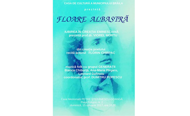 • sub genericul „Floare albastră”, la împlinirea a 167 de ani de la naşterea poetului naţional Mihai Eminescu, la Casa de Cultură Brăila are loc o seară de muzică şi poezie