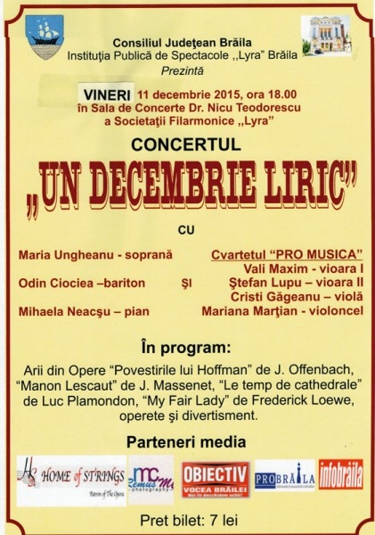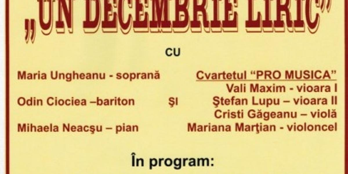 "Un decembrie liric". Spectacolul va fi susţinut de soprana Maria Ungheanu, baritonul Odin Ciociea, Mihaela Neacşu - pian şi Cvartetul "PRO MUSICA", cu Vali Maxim-vioara l, Ştefan Lupu -vioara ll, Cristi Găgeanu - violă şi Mariana Marţian - violoncel. În program sunt incluse arii din opere "Povestirile lui Hoffman" de J. Offenbach, "Manon Lescaut" de J. Massenet, "Le temp de cathedrale"de Luc Plamondon, "My Fair Lady" de Frederich Loewe, operete şi divertisment.