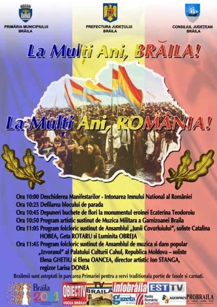1 Decembrie, Ziua Naţională a României, va fi serbată la Brăila pe acordurile Muzicii Militare, în pas de defilare a blocului de paradă. Nu puteau lipsi fasolea cu cârnaţi şi ceaiul fierbinte, servite brăilenilor aflaţi la eveniment.