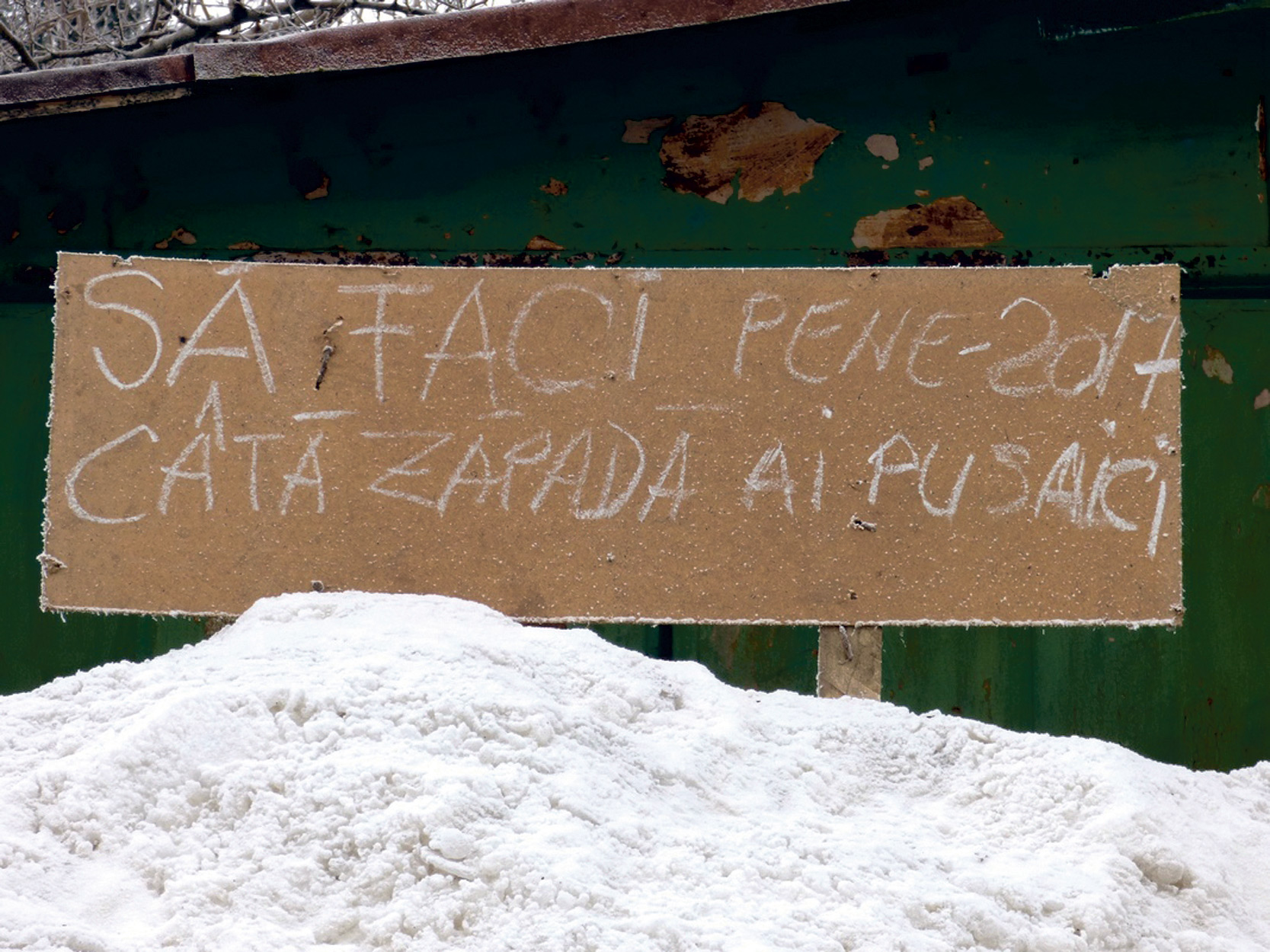 În cazul de faţă, însă, al brăileanului care s-a trezit cu muntele de zăpadă în faţa garajului, omul are perfectă dreptate. Prin urmare, acele două milioane de pene pe care brăileanul i le „urează” respectivului sunt perfect justificate. Eu nu m-aş grăbi să îi bat obrazul brăileanului care a lansat blestemul din poza alăturată. Şi asta pentru că, serios vorbind, el a fost băiat bun, în sensul că nu i-a „urat” chestii urâte, cu accidente, boli incurabile sau murit „instrumentul” la intrare, ci nişte banale pene. Şi ca să o zicem pe aia dreaptă, o pană la maşină nu a ucis pe nimeni. Dimpotrivă, când faci o pană îţi exersezi musculatura, mobilitatea, ba chiar şi psihicul îl pui un pic la treabă, căci nu e lucru uşor să dai ca nebunu’ la manivelă, singur cuc pe marginea drumului. (Neamu lu' MANIVELĂ)