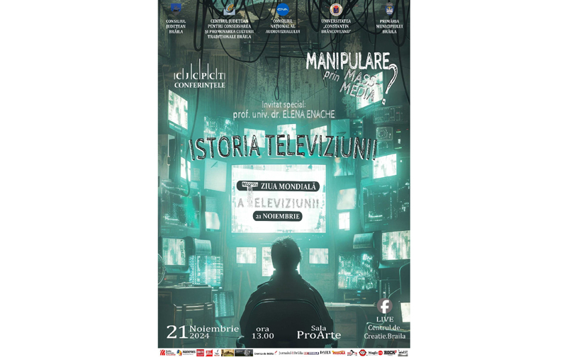 Consiliul Județean Brăila, prin Centrul Județean pentru Conservarea și Promovarea Culturii Tradiționale (Centrul de Creație) și Primăria Municipiului Brăila, în parteneriat cu Consiliul Național al Audiovizualului și Universitatea „Constantin Brâncoveanu”, organizează joi, 21 noiembrie, începând cu ora 13:00, în Sala ProArte, din Piața Traian nr. 2, conferința „Istoria televiziunii”, desfășurată sub egida „Manipulare prin mass-media”.