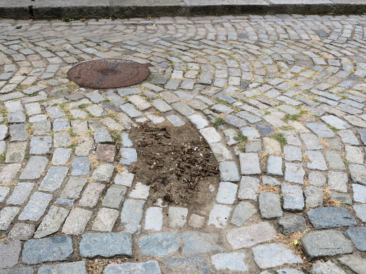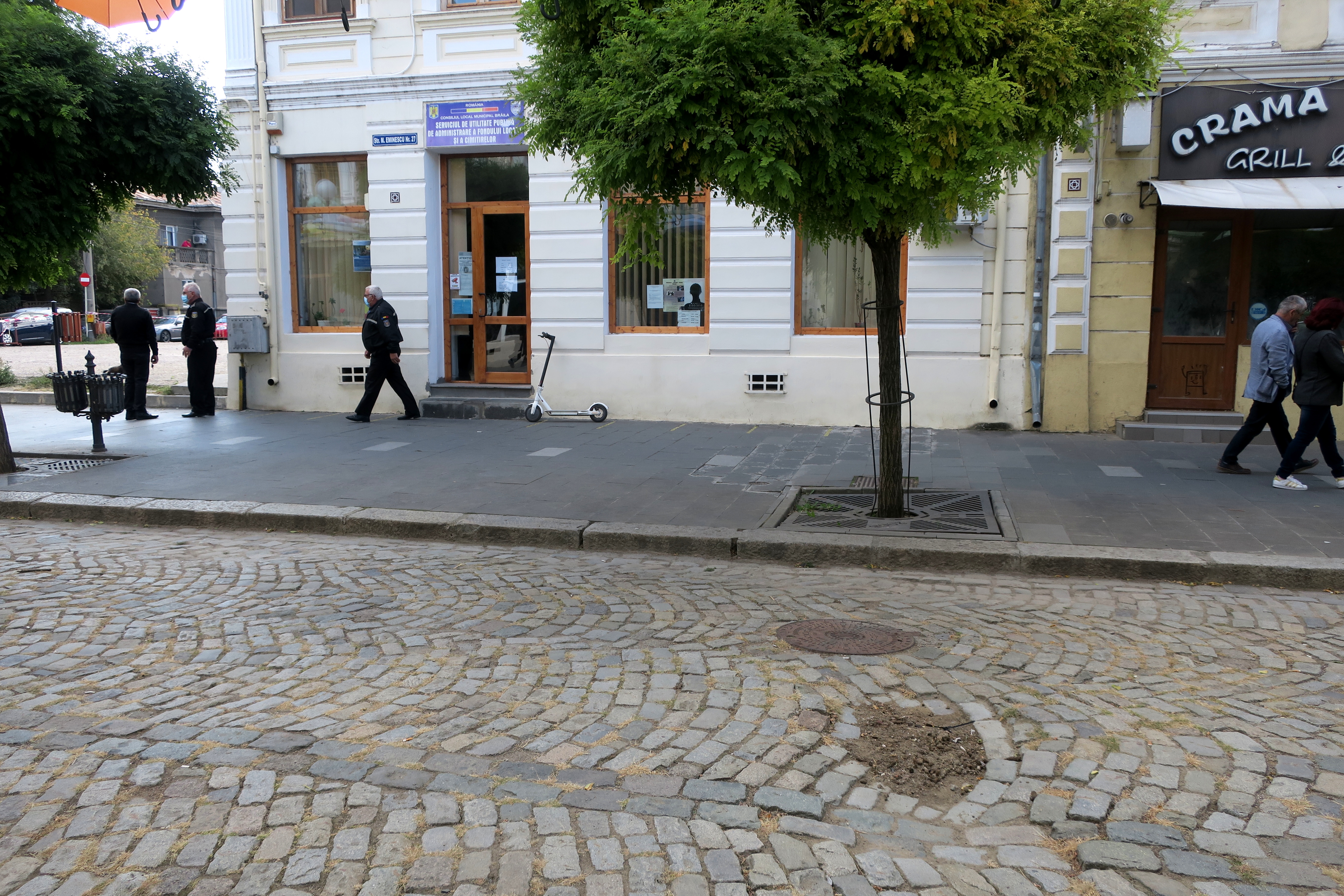 În ciuda umbrelelor colorate cu care Primăria încearcă să mai salveze aparențele în fiecare vară, strada Mihai Eminescu, fosta Regală a Brăilei, nu se ridică nici pe departe la înălțimea unei alei pietonale care să facă cinste unui Centru Vechi plin de tradiție. Și asta nu doar din cauza aspectului jalnic al unor clădiri precum fostul CEC sau fostul hotel Pescăruș. Mai sunt și alte detalii ce fac din Regala Brăilei mai degrabă o uliță de mahala decât un loc de promenadă. De exemplu, nu se știe cine a avut măreața idee, dar una dintre numeroasele denivelări din piatra cubică de pe carosabil a fost umplută cu... dejecții de câine. Efectiv, cineva a măturat dejecțiile și le-a pus grămadă în acea groapă, de parcă ar fi vrut să niveleze cu ele calea de călcare. Iar acei ”rahați” de câine stau acolo nu de ieri de azi, ci de săptămâni bune, deși groapa în cauză se află chiar în fața unei instituții din subordinea Primăriei Brăila, mai exact sediul Serviciului de Utilitate Publică de Administrare a Fondului Locativ și a Cimitirelor (SUPAFLC)!