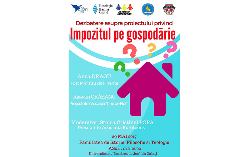 Măsura de a introduce impozitul pe gospodărie, propusă de Guvernul României, va fi dezbătută, luni, 29 mai, la Galaţi. Locul de întâlnire este pe strada Domnească, nr. 111, în sala AS011 a Facultăţii de Istorie, Filosofie şi Teologie din cadrul Universităţii “Dunărea de Jos” Galaţi, la ora 12.00.