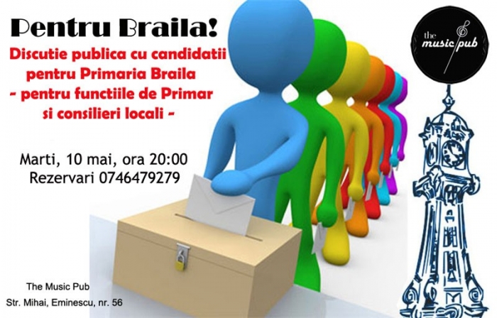 Prima dezbatere publică din această campanie electorală a candidaţilor la Primăria Brăila şi a celor care aspiră la un fotoliu de consilier va avea loc, în această seară, la ora 20:00, în The Music Pub. Potrivit unui comunicat de presă emis de organizatorul evenimentului, la întâlnire se va discuta într-o atmosferă caldă şi prietenoasă despre proiectele de dezvoltare şi administrare a Brăilei cu cei care au avut curajul să se înscrie în cursa pentru renaşterea acestui oraş. "Veţi avea posibilitatea să vorbiţi cu Cristian Techiu, Marian Ion, Nicuşor Cîrîc, Dorin Petrea, Lucian Căprariu, Adrian Tabarac, Marian Fusea şi alţi candidaţi care sunt interesaţi de o întâlnire cu electoratul brăilean. Dacă vă interesează soarta oraşului în care trăiţi, vă aşteptăm marţi, de la ora 20:00, în The Music Pub", a anunţat Cătălin Curcă, organizatorul evenimentului. De precizat că dezbaterea va fi filmată şi difuzată de TV Brăila. Cei interesaţi să participe la eveniment pot face rezervări la numărul de telefon 0746479279.