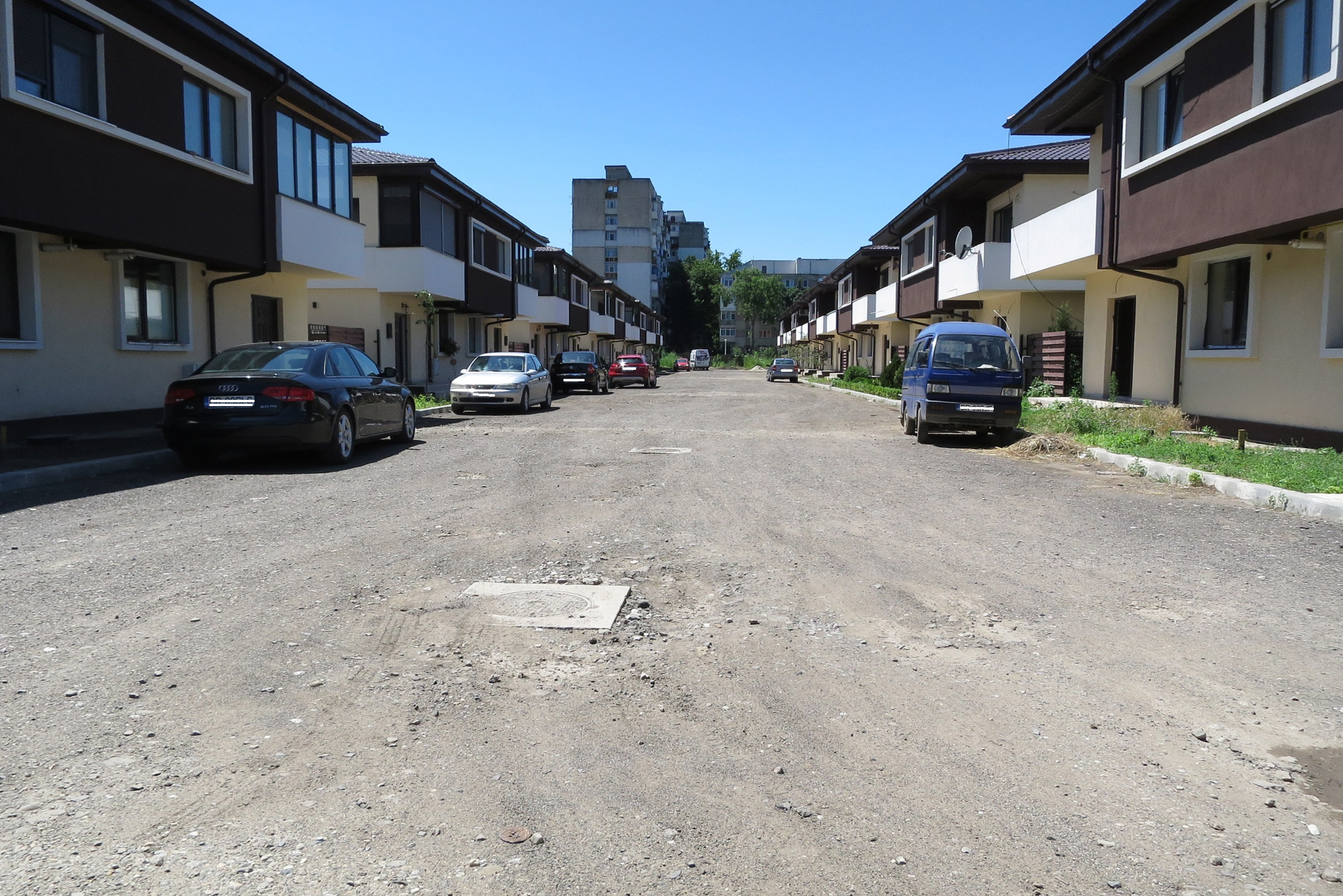 “Este praf pentru că nu s-a asfaltat, dar şi datorită vecinului de la APAN, care a lăsat un morman de gunoi acolo. Problema e destul de delicată, după părerea mea. Noi terminăm casele, dar vizavi ce se întâmplă? Imaginea generală o să fie una proastă. Da. Dar asta pentru că terenul e împărţit în două. Vizavi e o groapă de gunoi, de mormane, cu clădiri care cad peste noi. O să terminăm casele, dar oamenii săracii nu au nicio vină pentru ce este vizavi. Mai există şi drumul dintre cele două zone. Aici e o altă problemă legată de infrastructură, pentru că şi drumul acela trebuie conectat cu drumurile noastre. E destul de delicată situaţia”, a mai adăugat acesta.