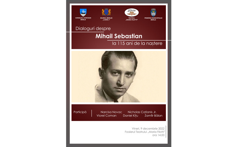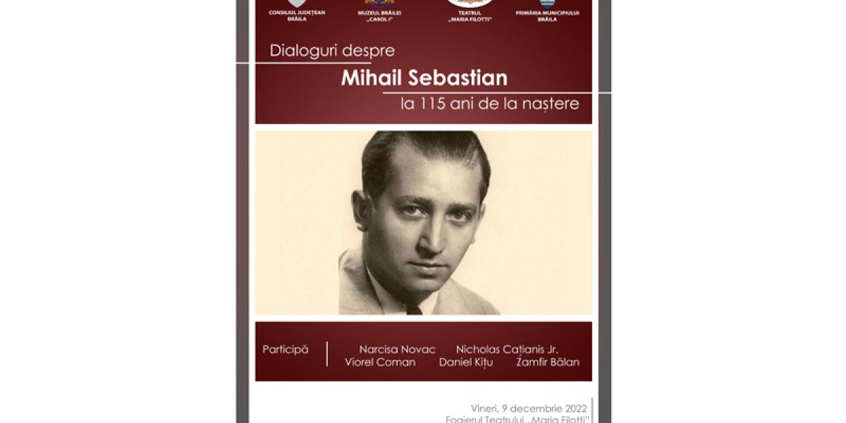 Muzeul Brăilei „Carol I” și Teatrul „Maria Filotti” îi invită pe brăilenii de toate vârstele vineri, 9 decembrie a. c., de la ora 14.00, la manifestarea culturală intitulată „Dialoguri despre Mihail Sebastian, la 115 ani de la naștere”. Potrivit comunicatului trimis de Muzeul Brăilei „Carol I”, la eveniment participă Narcisa Novac, Nicholas Cațianis Jr., Viorel Coman, Daniel Kițu și Zamfir Bălan. Evenimentul dedicat marelui scriitor brăilean are loc în Foaierul Teatrului „Maria Filotti”, iar intrarea este liberă.