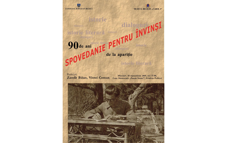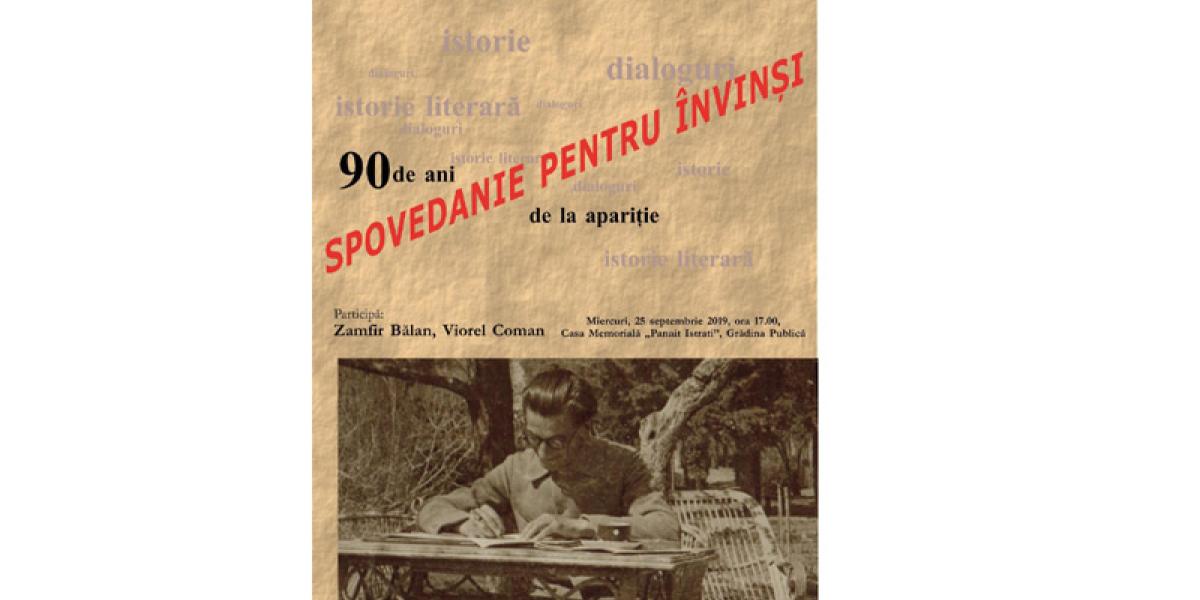 Astăzi, 25 septembrie 2019, ora 17, 00, la Casa Memorială “Panait Istrati” din Grădina Publică are loc un eveniment de dialoguri pe teme de istorie literară cu ocazia împlinirea a 90 de ani de la apariţia cărţii “Spovedanie pentru învinşi” de Panait Istrati. La discuţii participă Zamfir Bălan şi Viorel Coman.