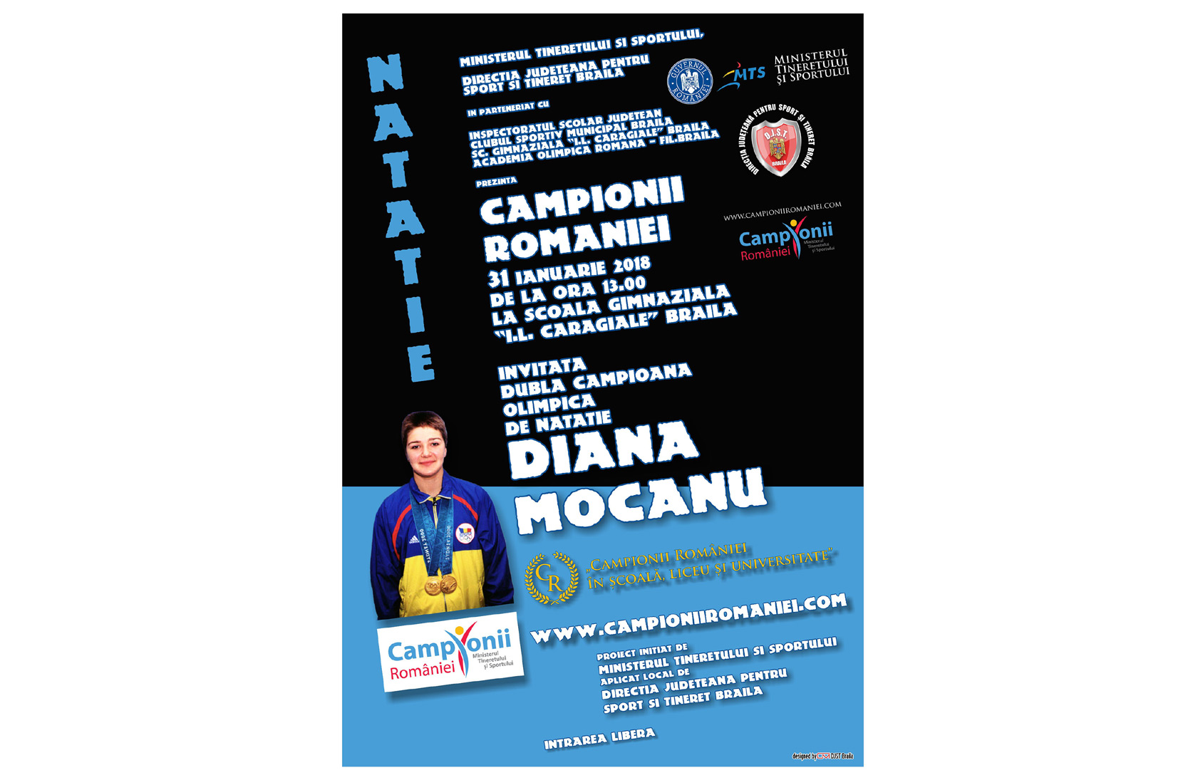• prima campioană olimpică din nataţia feminină românească le va povesti elevilor cum pot deveni campioni • evenimentul organizat pentru astăzi, la ora 13.00, de DJST Brăila face parte din proiectul naţional “Campionii României în şcoală, liceu şi universitate”