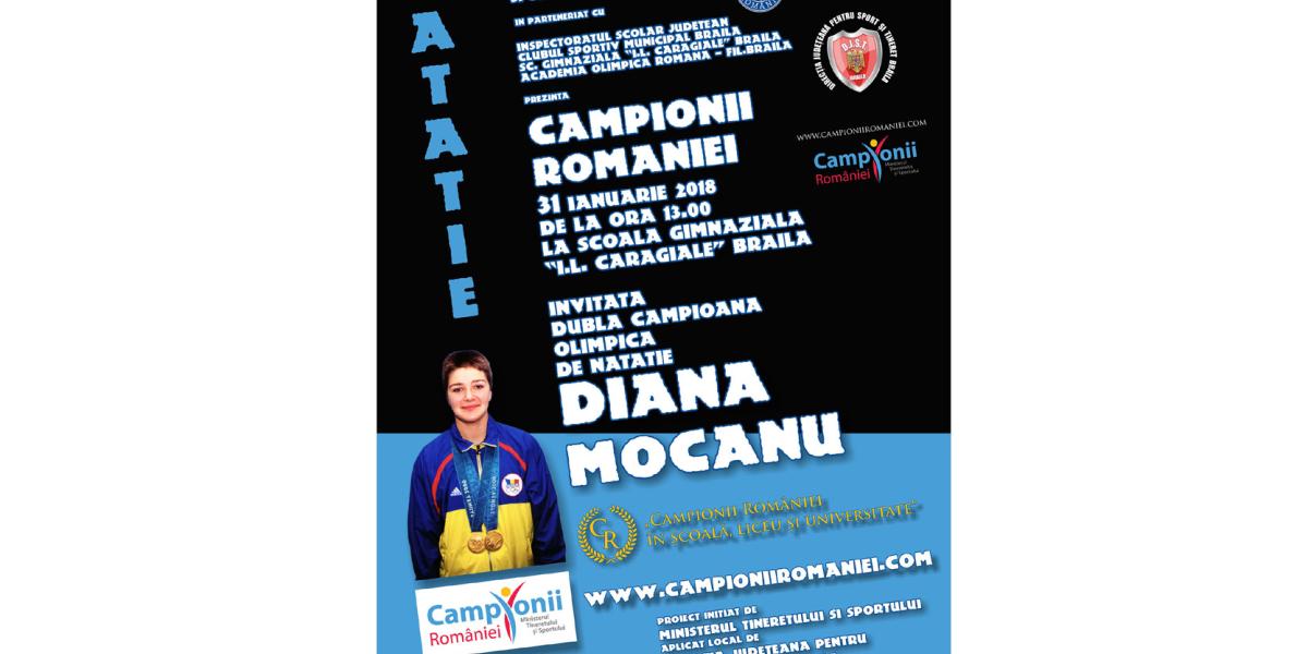Marea campioană a Brăilei şi a României, Diana Mocanu, înotătoare ale cărei performanţe vor fi foarte greu de egalat în ţară, se va întâlni miercuri, la ora 13.00, cu elevii de la şcoala IL Caragiale. Sportiva care a uimit o lume întreagă în 2000 la Sydney le va povesti copiilor cum pot deveni campioni.