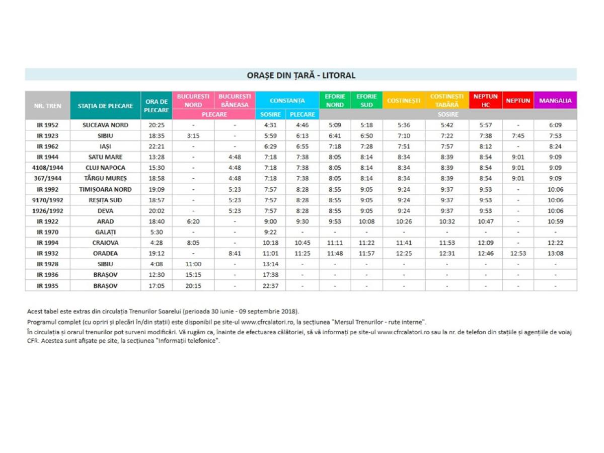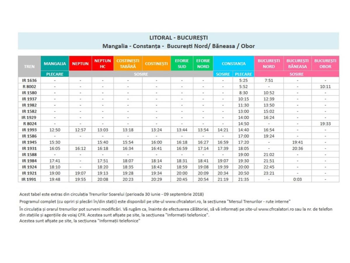 Începând din data de 29/30 iunie 2018 se pune în aplicare programul de circulaţie “Trenurile Soarelui” - program estival de transport al CFR Călători. Până la data de 9 septembrie, peste 40 de trenuri vor asigura zilnic legături directe din toată ţara către staţiunile de la Marea Neagră, către Delta Dunării şi retur. Pentru ca toate regiunile ţării să poată fi conectate cu destinaţiile de vacanţă cele mai căutate în perioada verii, 16 trenuri directe (incluzând şi ramurile aferente) vor avea ca destinaţie Constanţa/ Mangalia, în timp ce 17 de trenuri vor pleca zilnic din gările Capitalei spre Constanţa, din care 7 ajung la Mangalia.