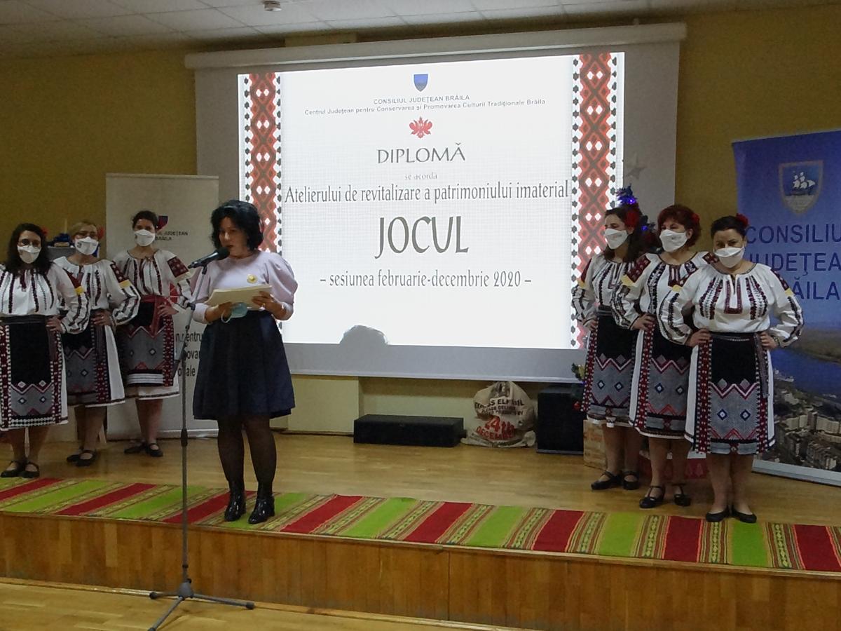 * de câțiva ani, la Centrul de Creație Brăila funcționează Atelierul de revitalizare a patrimoniului etnografic imaterial – “Jocul”, unde 25 de educatoare, învățătoare și profesoare vin în fiecare marți să învețe dansuri populare * apoi, cadrele didactice au grijă ca toți pașii de dans și toate tehnicile pe care le deprind la cursuri să le transmită mai departe elevilor de la clasă, ba chiar în unele școli s-au înființat și ansambluri populare * iar pentru a le arăta și mai bine copiilor ce înseamnă curajul și pasiunea pentru tradiții și pentru dansul popular, în urmă cu o lună, 12 membre ale Formației “Jocul” au participat la emisiunea “Românii au talent”, acolo unde au obținut 4 de “DA!”