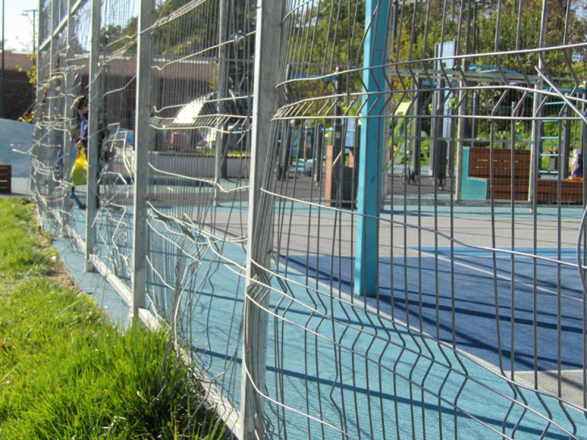 Revenind la dotările moderne actuale, împrejmuit cu plasă este doar terenul pentru baschet, cu precizarea că pe latura dinspre blocuri există un alt model de plasă, mai trainică şi dublată de cea împletită: foarte deasă, cam inestetică, dar rezistentă şi rămasă de la fosta arenă a SANAB. Necazul este altul: de câtva timp, s-a ales praful de împrejmuirea nouă pentru baschet. Cauzele sunt mai multe: practicarea fotbalului, mai exact o miuţă, de către două – trei echipe, formate din 2-3 copii sau peste 15 ani, şi care trag şuturi spre o poartă imaginară. Pe lângă faptul că aceştia îi deranjează pe baschetbaliştii amatori, prin jocul de fotbal s-a ajuns la distrugerea pe circa 15 metri a plasei de protecţie a terenului. Ruptă intenţionat apoi pentru accesul mai facil pe teren şi îndeosebi din cauza slabei rezistenţe a plasei: subţire şi sudată automat, prin metoda punctului electric. Astfel, sudura este atât de superficială încât, prin pipăit (după dezlipire) aproape nici nu se simte/vede că acolo a fost vorba de sudură. Tot la acest teren, poarta de intrare, care noaptea ar trebui închisă cu lacăt, a fost vandalizată, prin distrugerea ivorului.