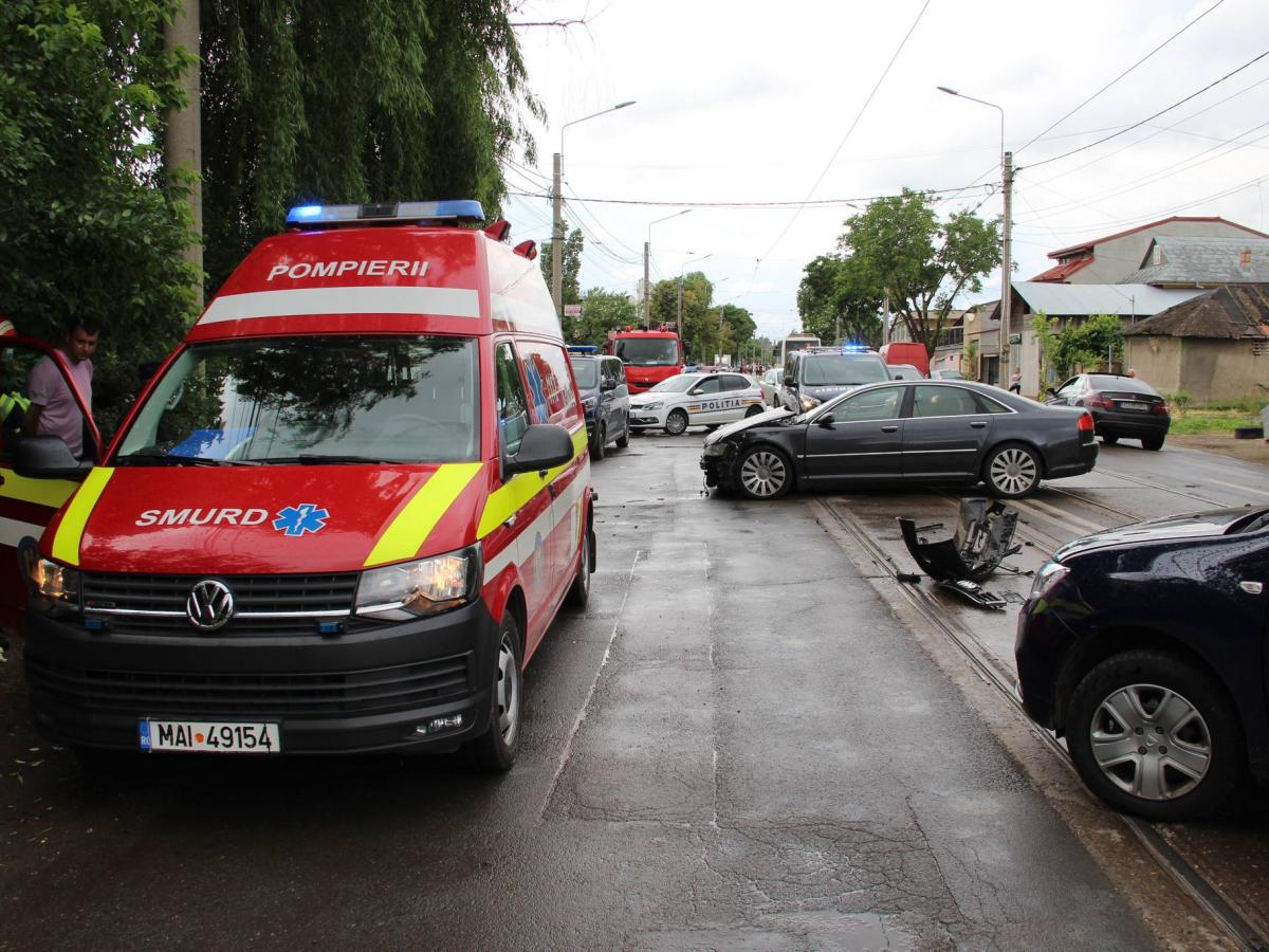 * duminică, în jurul orei 14.40, un accident rutier s-a produs pe raza municipiului, la intersecţia străzii Cimbrului cu şoseaua Baldovineşti * din primele date reiese că un autoturism marca Audi a ieşit de pe strada Cimbrului şi a lovit în partea dreaptă autospeciala Jandarmeriei, doi subsofiţeri ajungând la spital