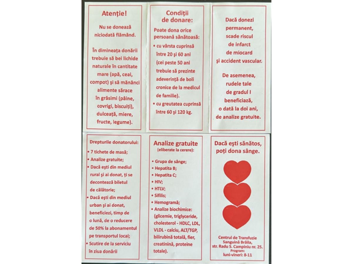 • deși numărul donatorilor este în creștere la Centrul de Transfuzie Sanguină Brăila, nevoia de sânge rămâne constantă • oricine are între 18 și 60 de ani, este sănătos și îndeplinește condițiile necesare poate dona și contribui la salvarea a până la trei vieți cu o singură donare • anul trecut, 10.032 de persoane au ales să doneze, iar de la începutul acestui an, 2.407 donatori au trecut pragul centrului pentru a oferi o șansă la viață celor aflați în nevoie