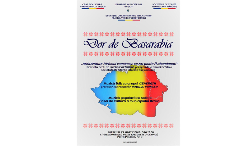 Miercuri, 27 martie 2019, începând cu ora 17.30, la Casa Memorială Petre Ştefănescu-Goangă, din Piaţa Poligon nr. 2 va avea loc manifestarea cultural-artistică “Dor de Basarabia”, prilejuită de împlinirea a 101 de ani de la Unirea Basarabiei cu România. Evenimentul este organizat de Casa de Cultură a Municipiului Brăila, în colaborare cu Asociaţia ProBasarabia şi Bucovina – filiala Vasile Voloc, Brăila şi Societatea de Ştiinţe Istorice din România.
