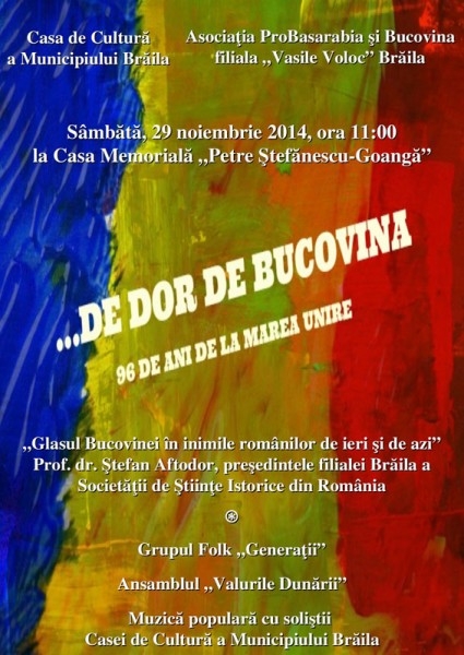 Manifestarea va debuta cu o prelegere a prof. dr. Ştefan Aftodor, preşedintele Societăţii de Ştiinţe Istorice din România, filiala Brăila, intitulată "Glasul Bucovinei în inimile românilor de ieri şi de azi" şi va continua cu un program artistic. Vor evolua: Grupul Folk "Generaţii", instructor prof. Dumitru Popescu, ansamblul "Valurile Dunării", instructor Marius Mugur Anghelescu şi soliştii de muzică populară ai Casei de Cultură a municipiului Brăila, instructor Dănuţ Militaru.