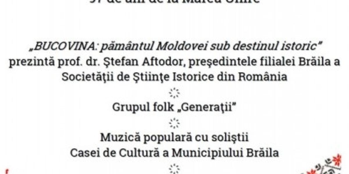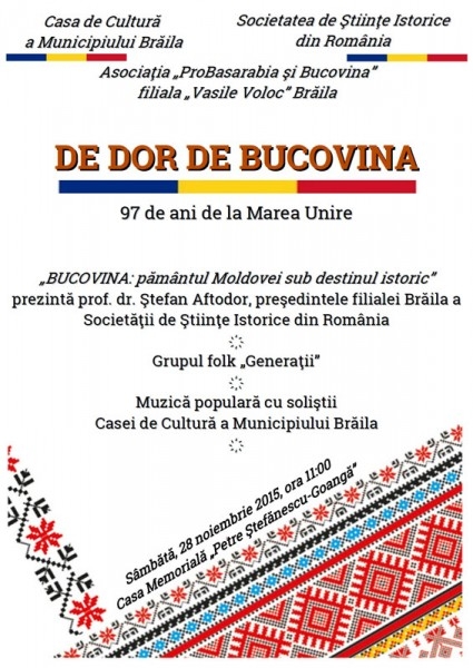 Casa de Cultură a Municipiului Brăila, în colaborare cu Societatea de Ştiinte Istorice din România şi Asociaţia „ProBasarabia şi Bucovina", filiala „Vasile Voloc", organizează manifestarea cultural-artistică DE DOR DE BUCOVINA, prilejuită de împlinirea a 97 de ani de la proclamarea unirii Bucovinei cu România.