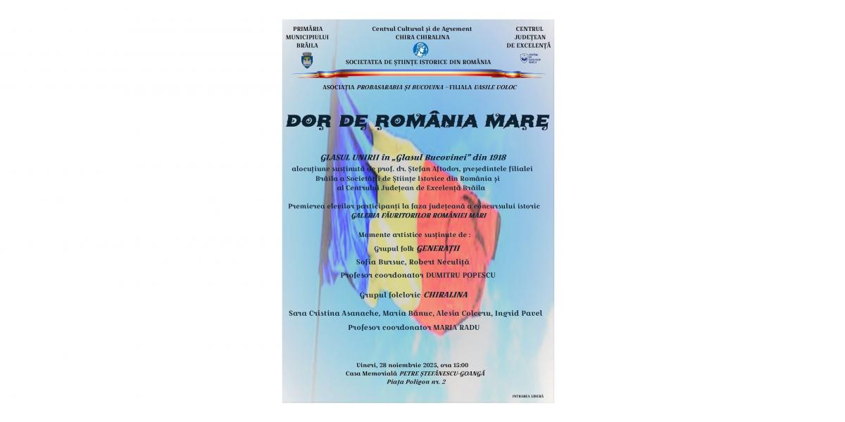 În semn de respect pentru memoria istoriei și față de valorile care au unit poporul român, Centrul Cultural și de Agrement „Chira Chiralina” Brăila, în colaborare cu Societatea de Științe Istorice din România - Filiala Brăila, Centrul Județean de Excelență Brăila și Asociația „Pro Basarabia și Bucovina” - Filiala „Vasile Voloc”, organizează manifestarea intitulată „Dor de România Mare”, prilejuită de împlinirea a 107 de ani de la proclamarea Unirii Bucovinei cu România.
