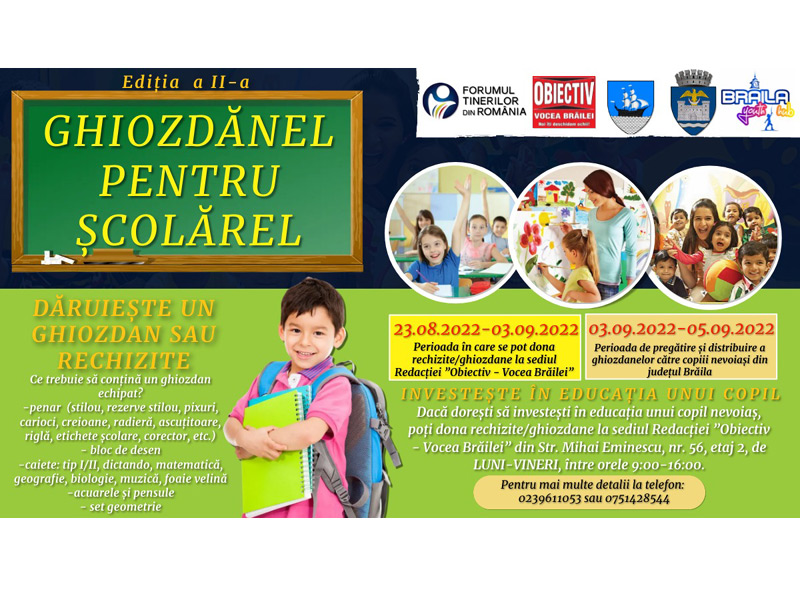 Ediția a doua a campaniei ”Ghiozdănel pentru școlărel” este organizată de Asociația ”Pentru Adevăr”, cotidianul “Obiectiv - Vocea Brăilei”, Forumul Tinerilor din România - Brăila și Centrul de Tineret - Brăila Youth Hub, în parteneriat cu